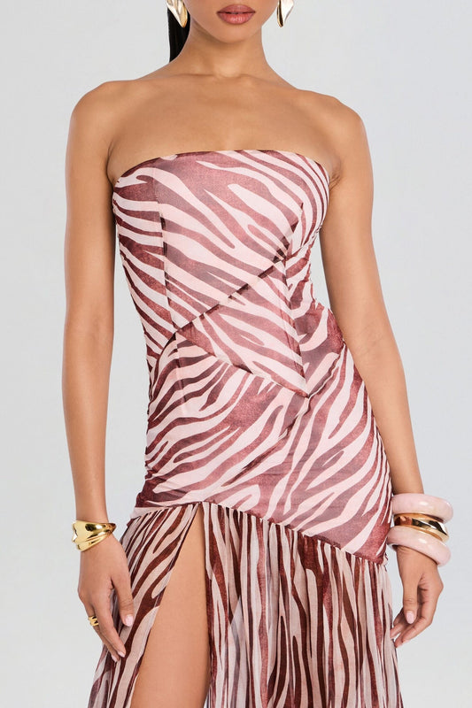 Shmaka Zebra Print Strapless Slit Maxi Dress