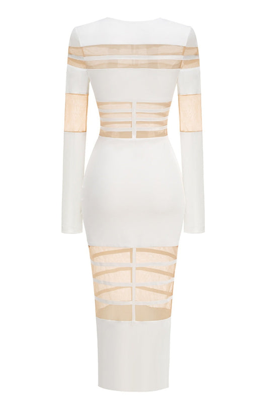 Genesis Off Shoulder Feather Mesh Midi Bandage Dress - White