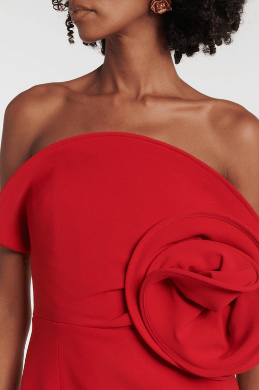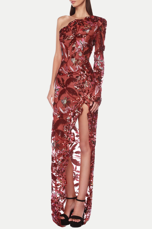 Opal Floral Sequin Embroidered One Shoulder Midi Dress - Red