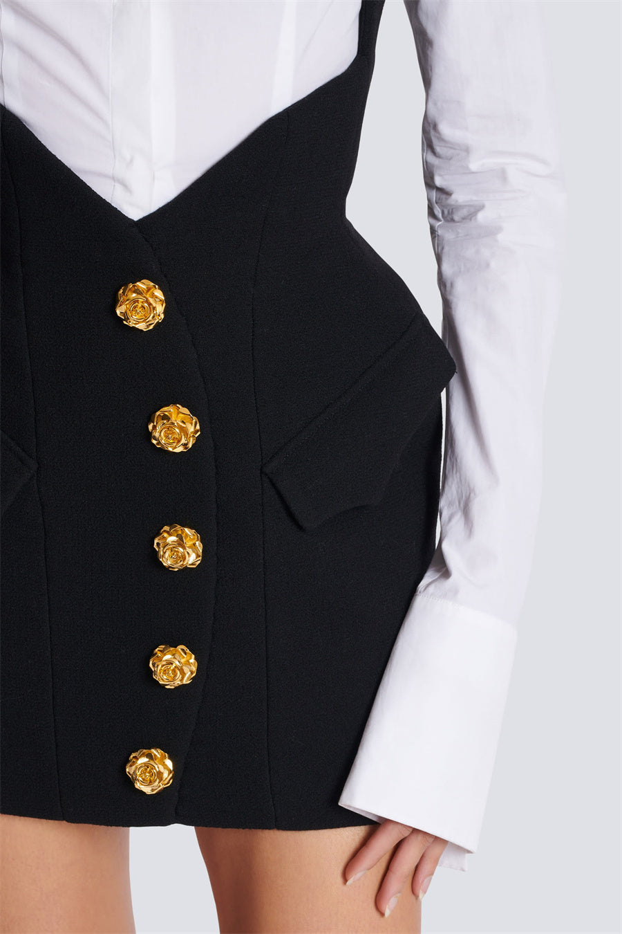 Elevate your wardrobe with our Analia Tulip Halter Skirt. Luxurious gold buttons adorn this sophisticated piece, adding a touch of elegance to your look. The halter design creates a flattering silhouette, making it a must-have for any fashion-forward individual. Experience the exclusive style and artistry of our Analia Tulip Halter Skirt.