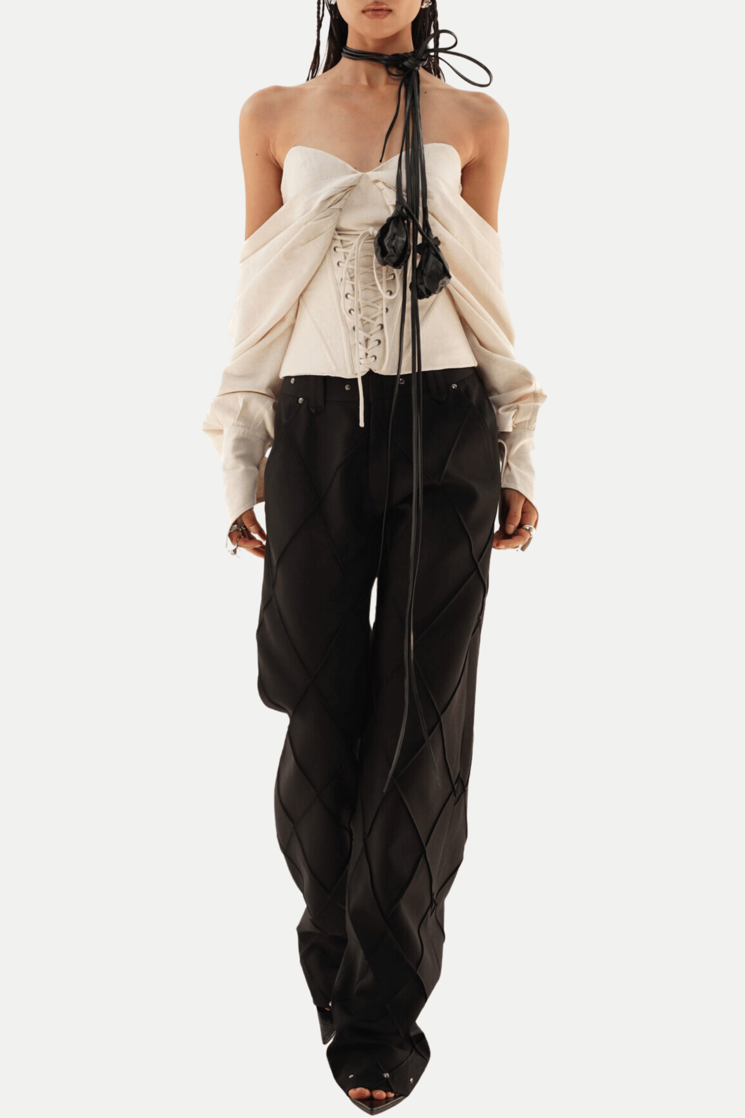 Unleash your bold and daring side with the Andaia Off Shoulder Lace Up Corset Top. The lace up corset design adds a touch of edgy femininity, while the off shoulder style exudes confidence and allure. Elevate your style game and stand out in this statement piece.