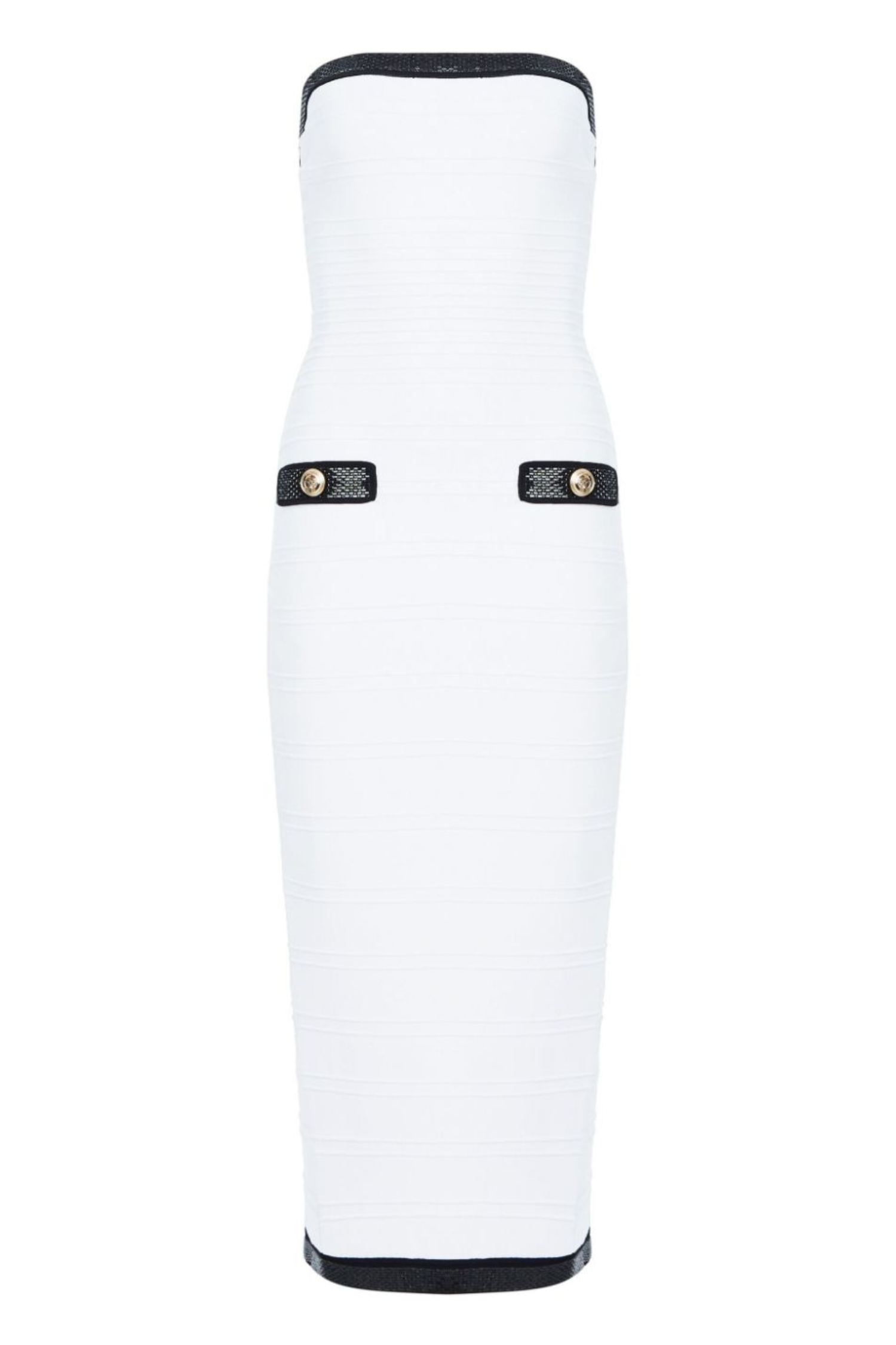 Indulge in luxury with the Anklyn Ribbed Strapless Midi Bandage Dress. This exquisite dress features a ribbed design and a strapless silhouette for a chic and timeless look. Crafted with high-quality bandage material, it hugs your curves in all the right places, making you feel confident and sophisticated. Perfect for any special occasion, this dress is a must-have for your wardrobe.