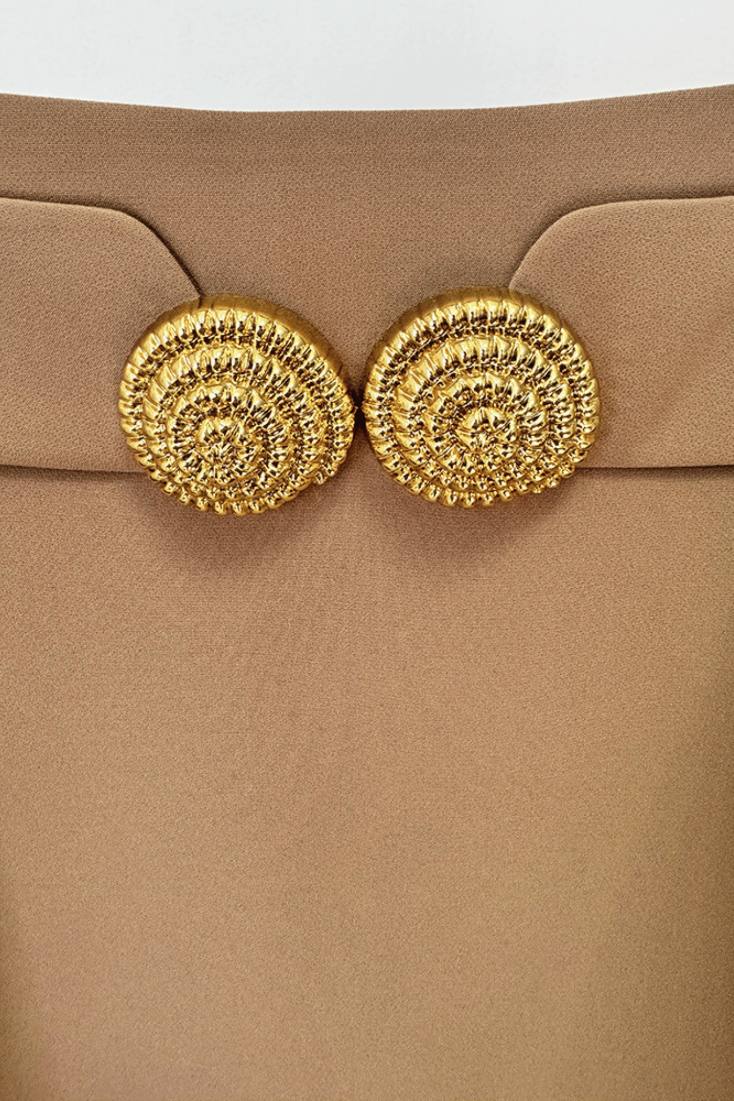 Elevate your style with our Asina Gold Buttoned Mini Skirt in Khaki. Made with luxurious materials and adorned with gold buttons, this skirt exudes sophistication and exclusivity. Perfect for a night out or a special occasion, it's a must-have for any fashion-forward woman. Add it to your wardrobe and make a statement.