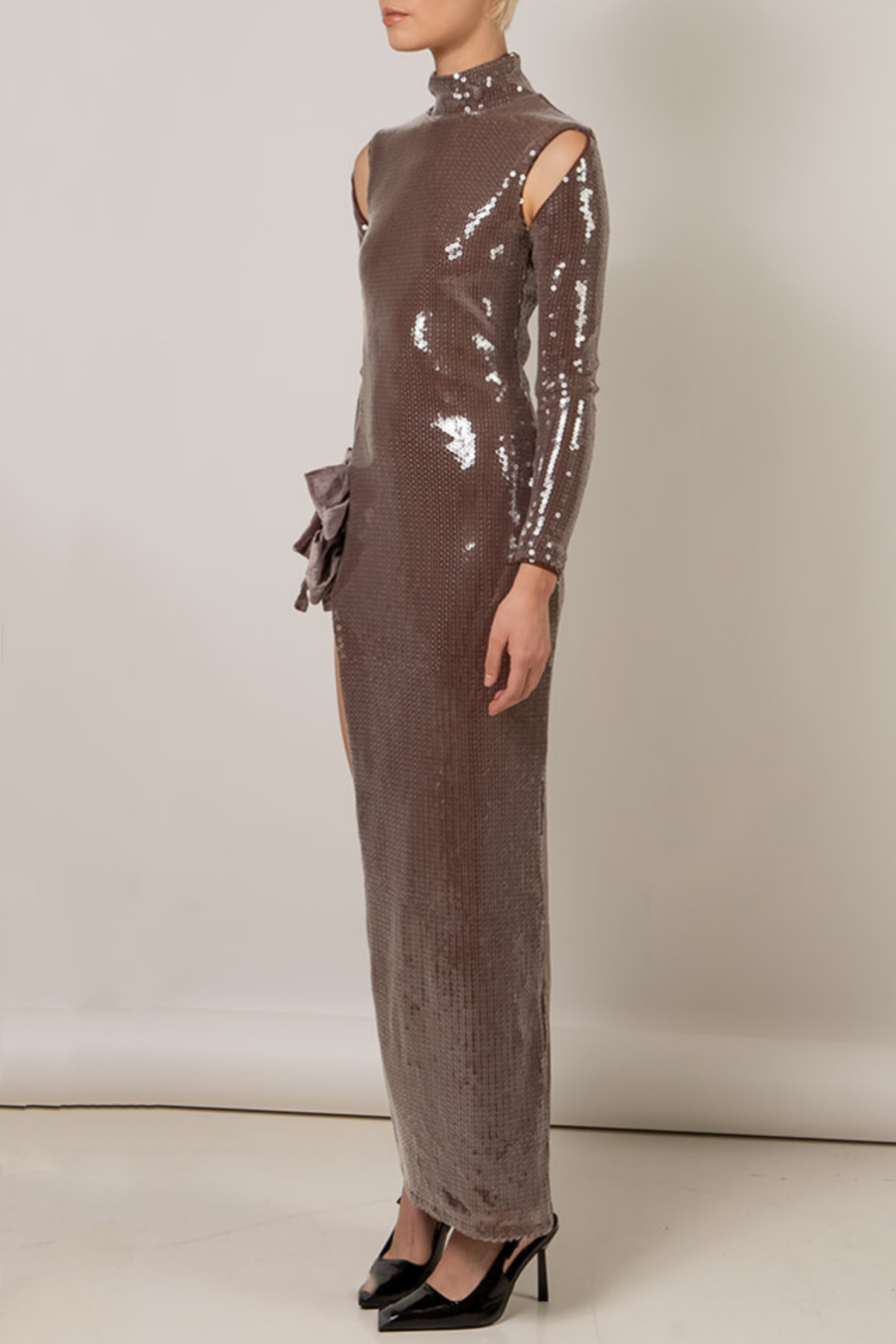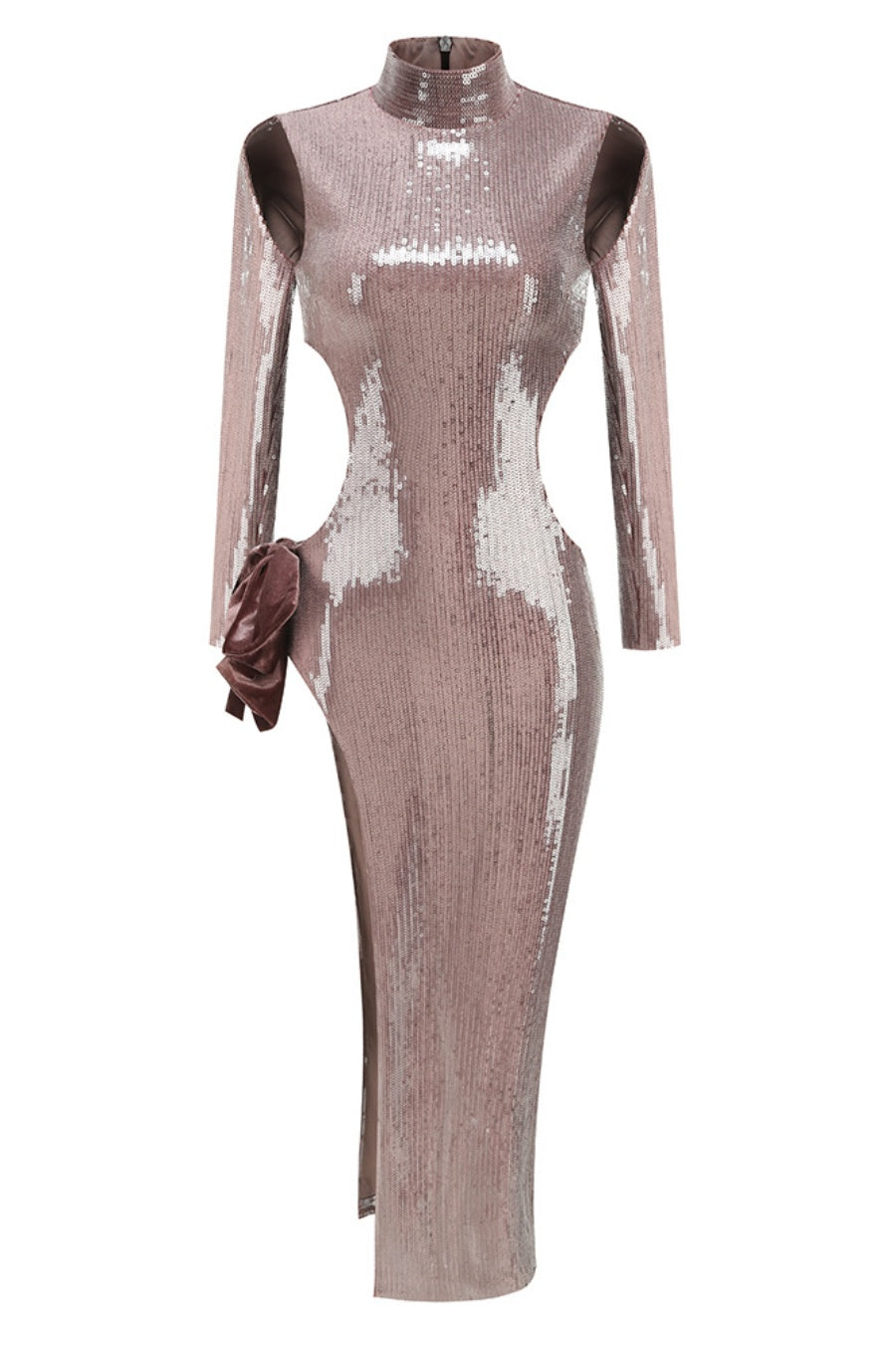 Indulge in luxury and elevate your style with our Calla Sequin Cutout Slit Maxi Dress. Featuring intricate bow embellishments and a daring cutout design, this dress exudes sophistication and exclusivity. The sequins add a touch of glamour, while the slit adds a flirty touch. Perfect for any special occasion.