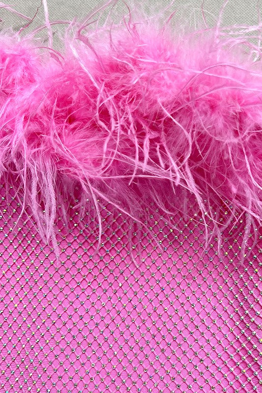 Sparkle midi dress with an open neckline and shoulders, complemented by feathers. Dress has a high thigh slit for a contemporary twist. Crafted from our classic mesh translucent fabric covered in rhinestones.