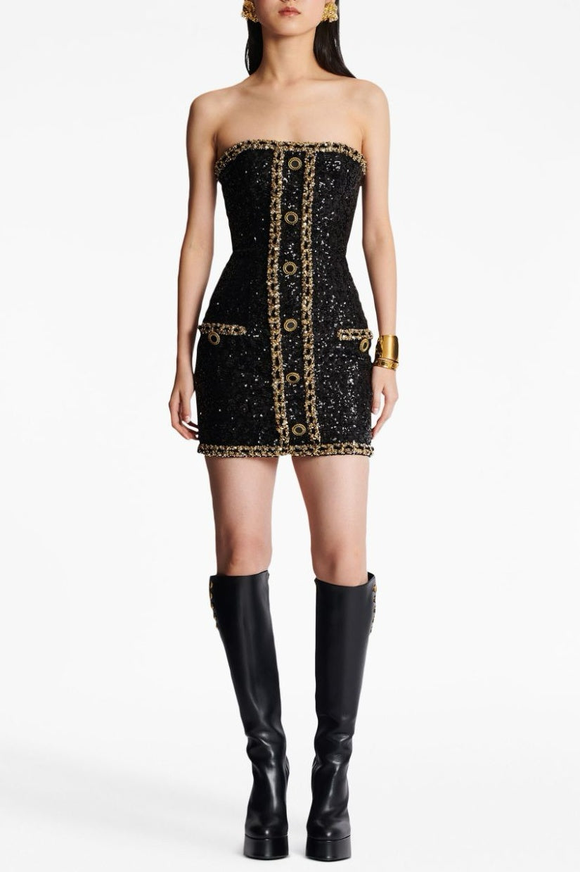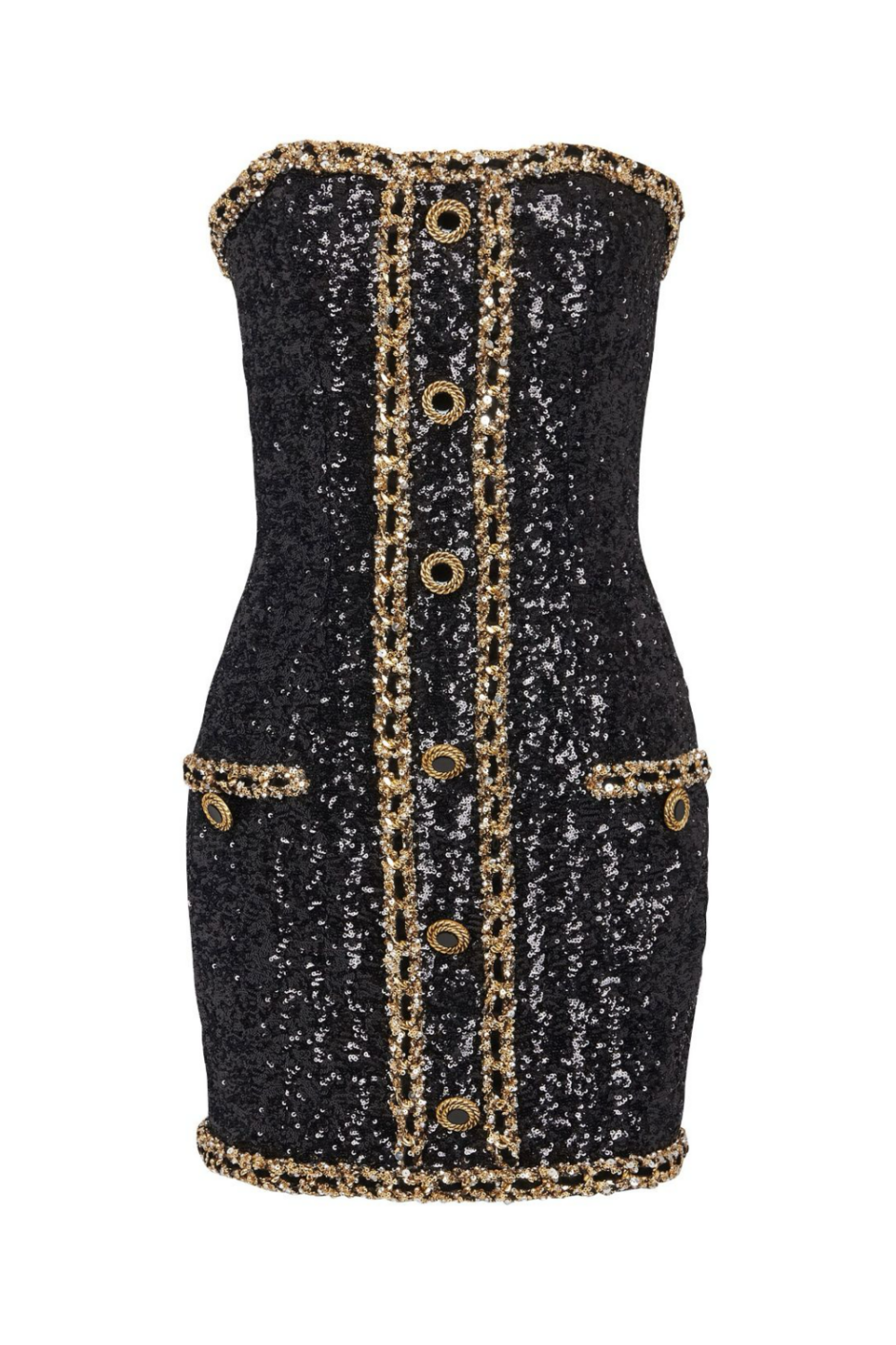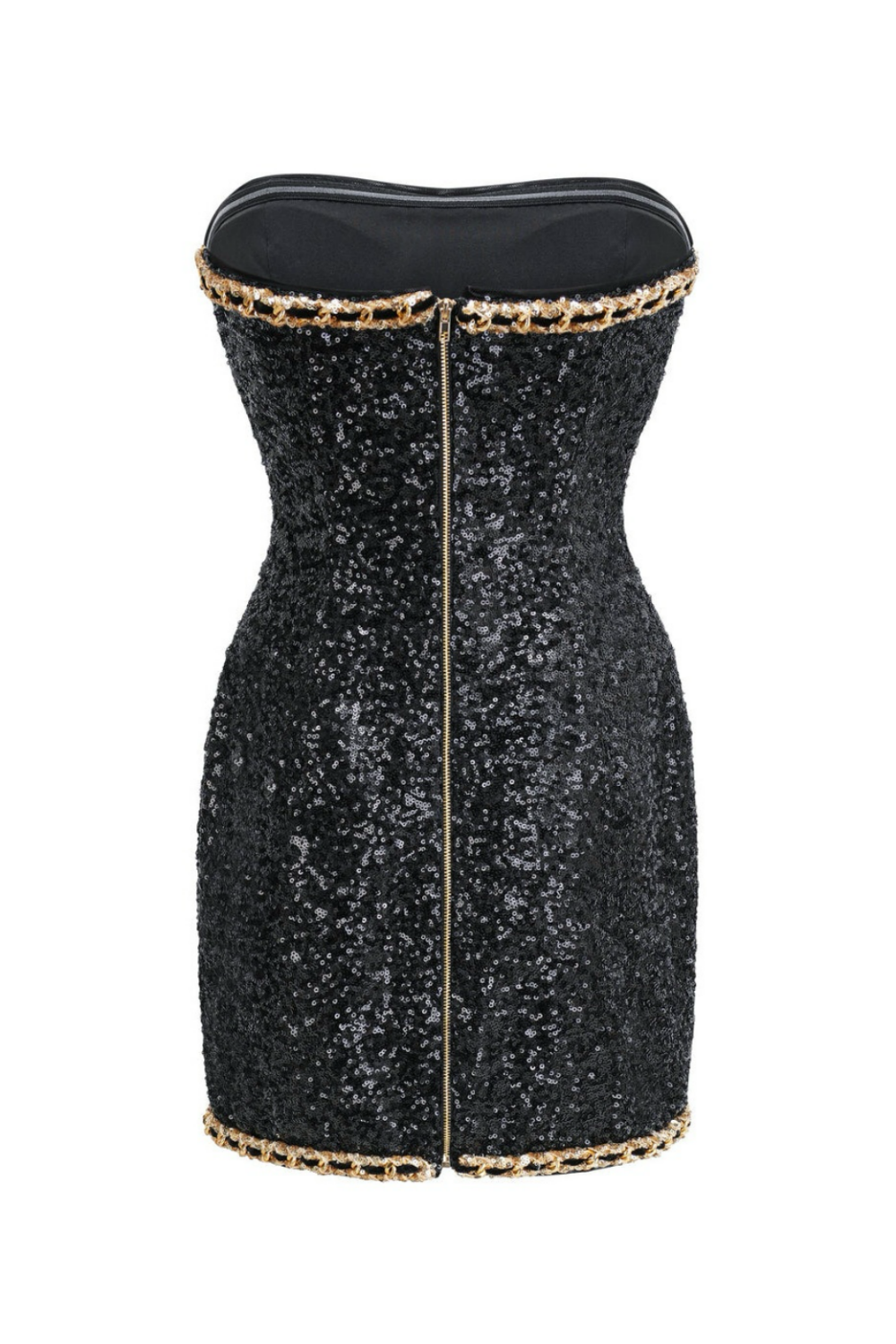 Indulge in ultimate luxury with the Cleo Sequin Embellished Strapless Mini Dress. Adorned with exquisite sequins, this dress will make you stand out at any event. The strapless design allows for a sleek silhouette, while the mini length adds a touch of playfulness. Make a statement and turn heads in this exclusive piece.