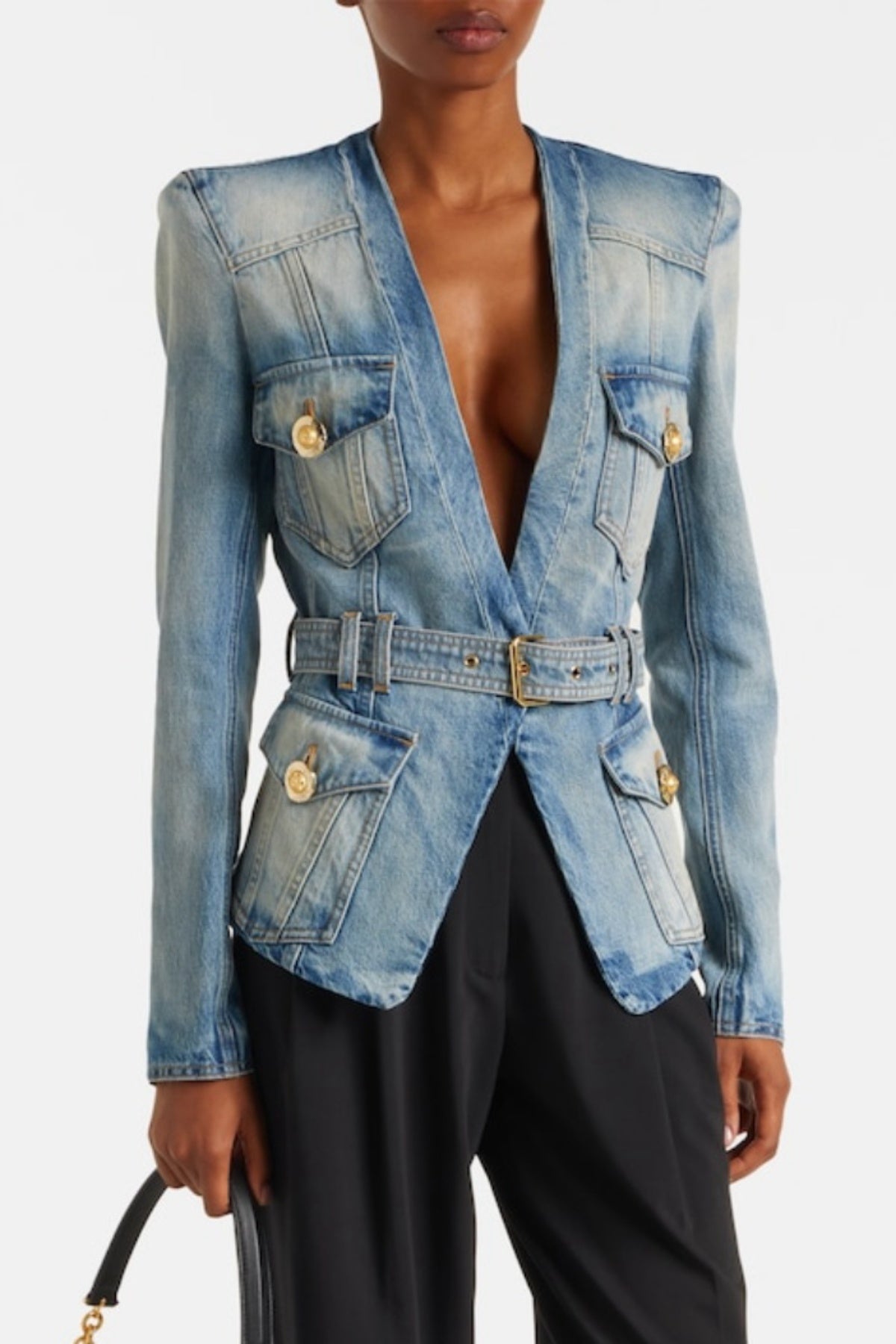 The Delena Belted Denim Jacket redefines bold style with its sharp silhouette and cinched waist belt that commands attention. Crafted from durable denim, it combines rugged edge with a tailored fit, perfect for making a confident statement wherever you go. Elevate your wardrobe with a jacket that dares to stand out.