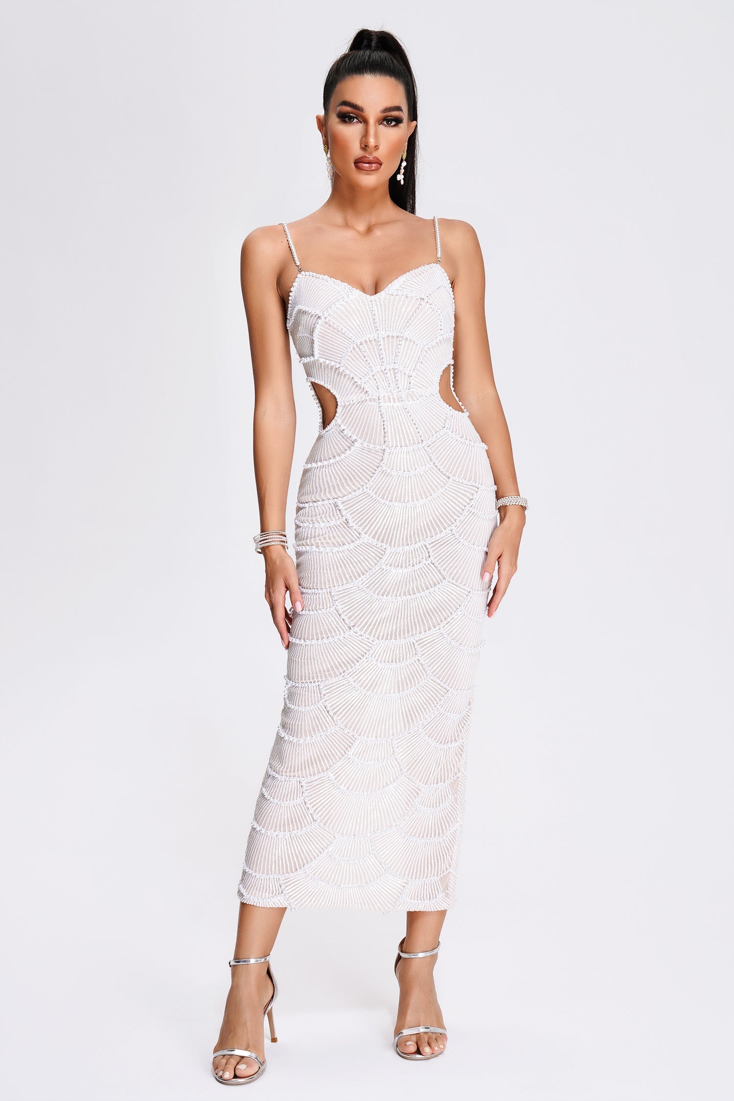 Elevate your evening with the Ella Pearl Sequin Cutout Midi Dress!  Crafted with meticulous attention to detail, it features a cascade of shimmering pearl sequins that create an ethereal, starlit effect. The daring waist cut-out adds a touch of allure, making this dress a showstopper.   Whether it's a glamorous gala, a formal event, or an intimate dinner, it is your ticket to unforgettable elegance and style. Pair the Ella Pearl Sequin Cutout Midi Dress with strappy heels or stiletto sandals to add a touch of sophistication.