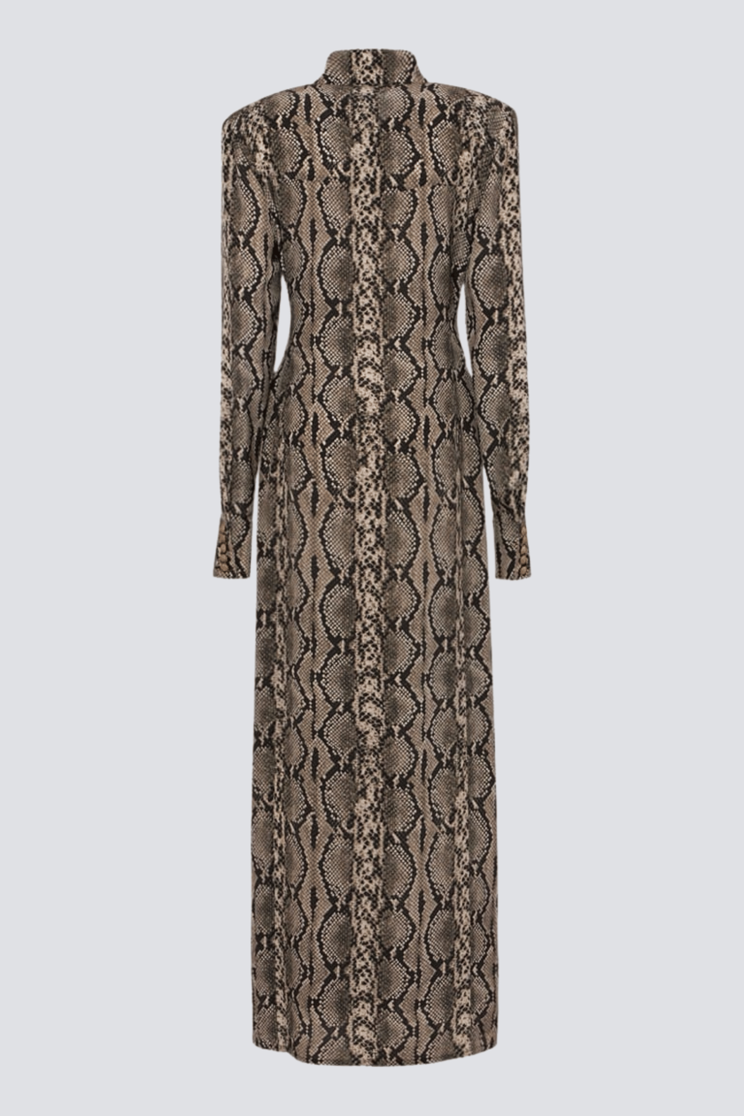 Introducing our Filis Snake Print Maxi Shirt Dress - a luxurious and exclusive addition to your wardrobe. Crafted with a sophisticated snake print design, it exudes elegance and style. The flowing maxi length adds a touch of refinement while the shirt dress silhouette offers versatility and comfort. Elevate your look with this stunning piece.