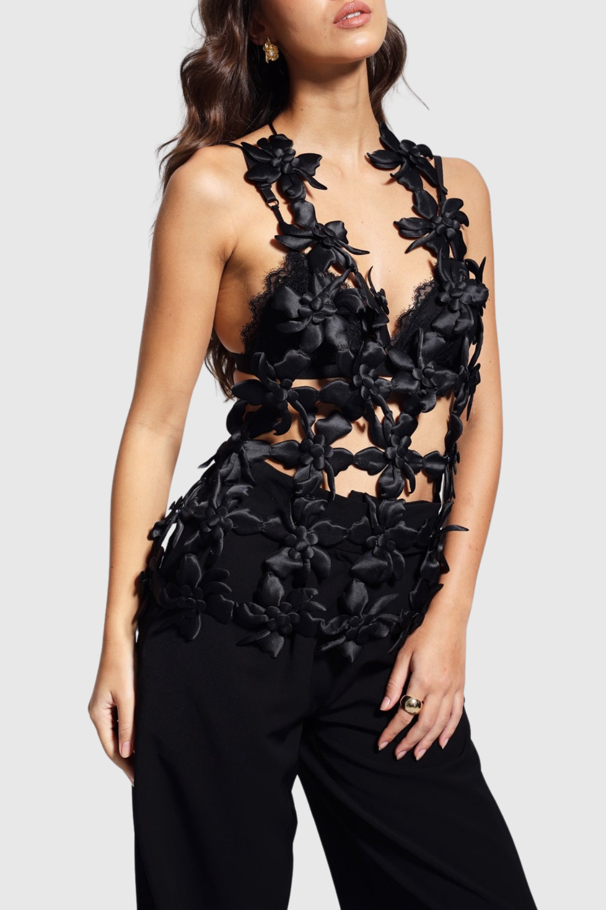 Unleash your inner goddess with the Juliete Floral Cutout Backless Top. Featuring intricate floral appliqués and a bold cutout back, this top is sure to turn heads. Perfect for a night out or a special occasion, pair it with your favorite high-waisted pants or skirt for a sophisticated and luxurious look. Elevate your wardrobe with this exclusive piece