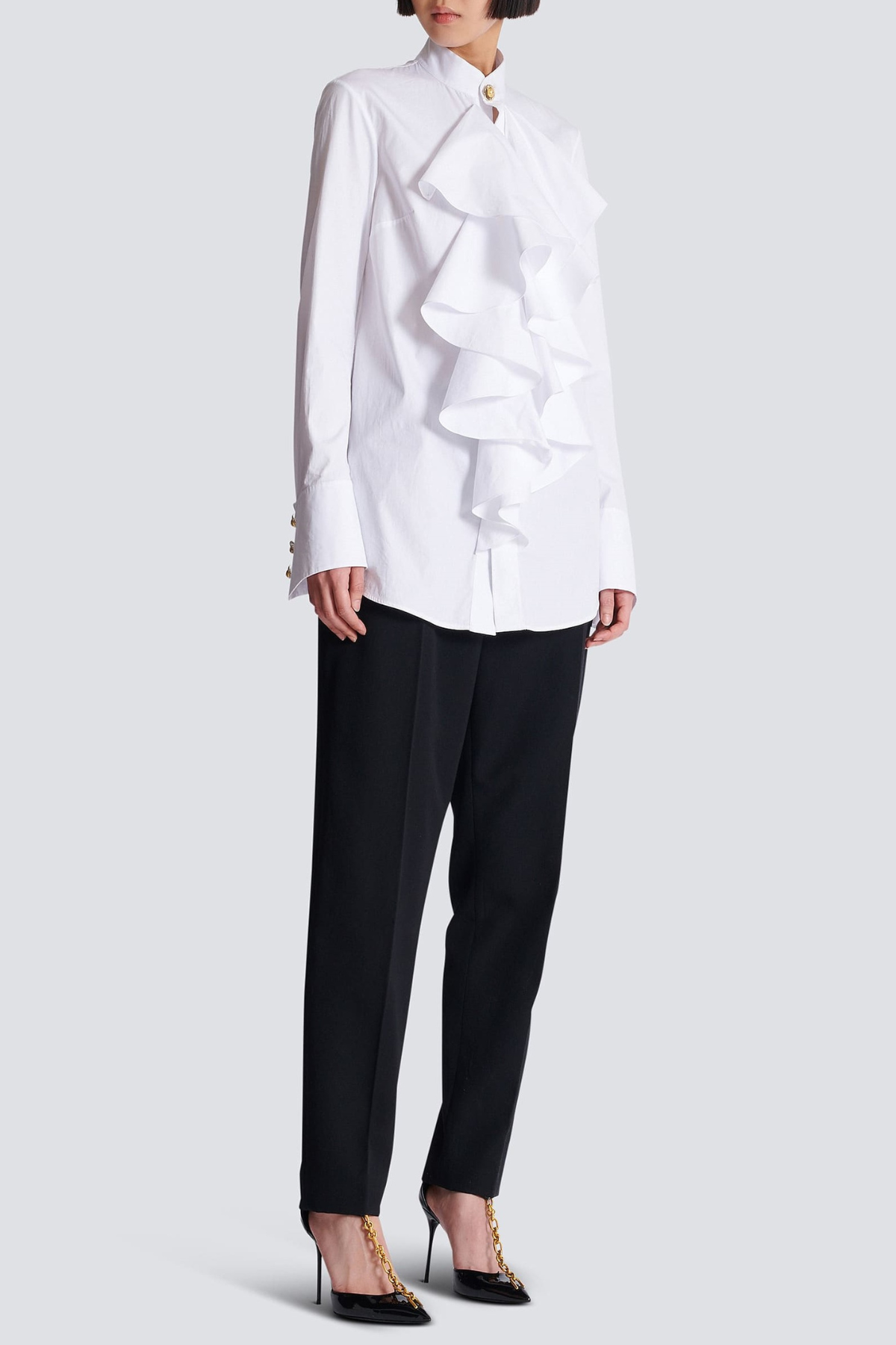 Elevate your wardrobe with the Kania Ruffle Shirt, a refined piece that blends classic elegance with modern flair. Its delicate ruffle details add a touch of sophistication, while the tailored fit ensures a flattering silhouette. Perfect for both professional settings and stylish evenings, this shirt delivers effortless grace and versatility. Crafted from quality fabrics, it offers comfort alongside its polished look.