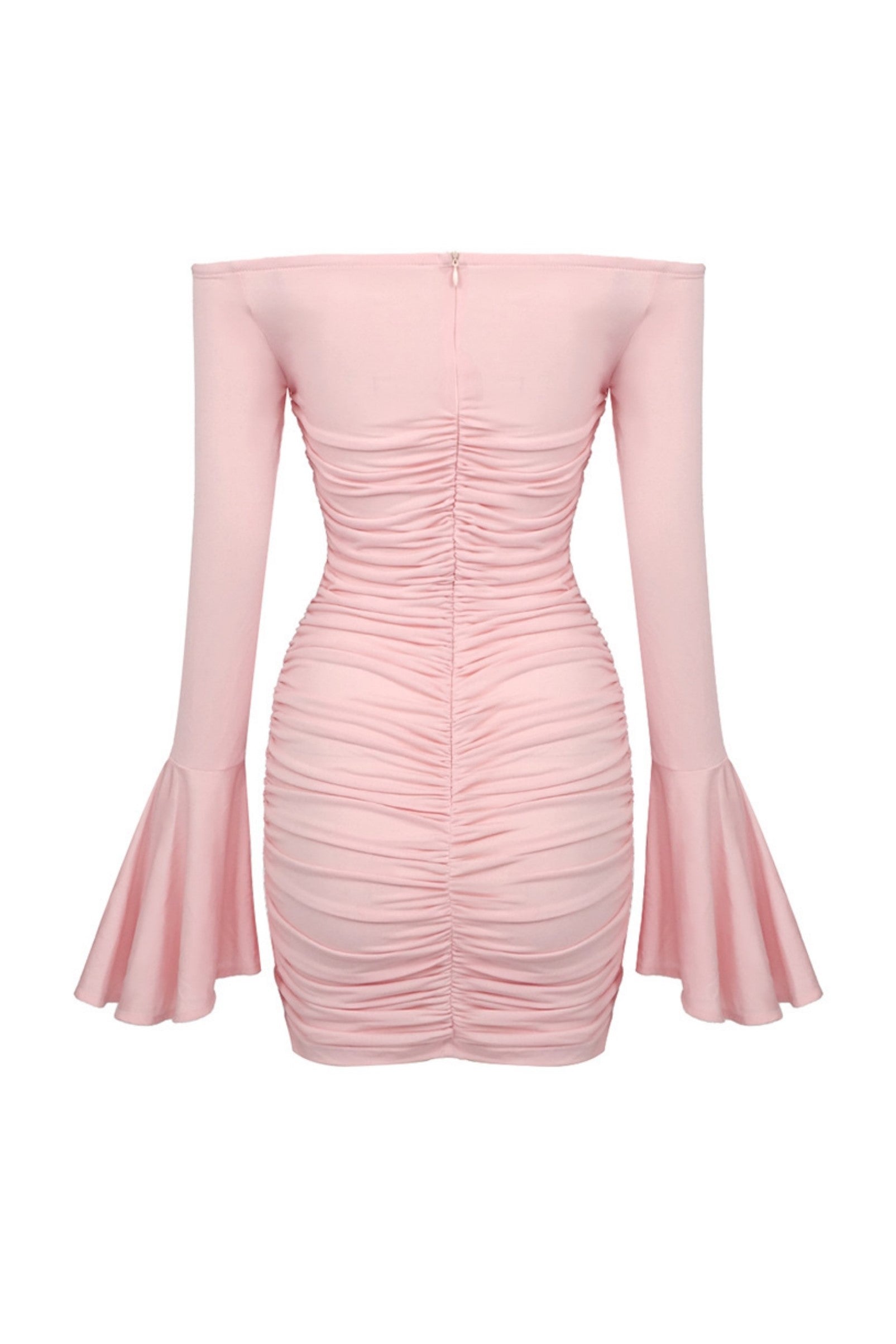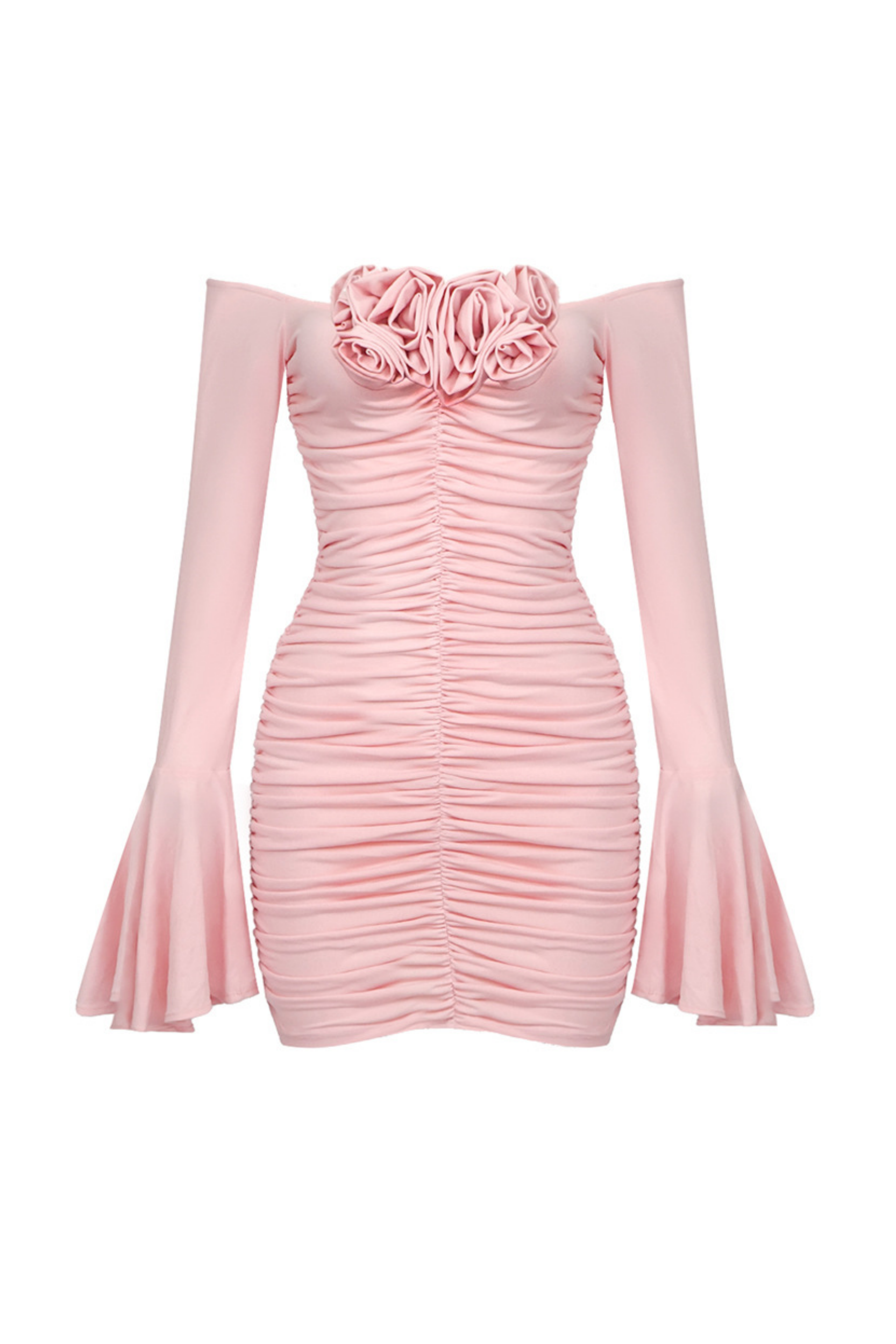 Dress to impress with the Karla Ruched Flower Off Shoulder Mini Dress. The delicate flower detailing and off shoulder design exude elegance and femininity. The ruched fabric adds a touch of sophistication, making this a must-have for any special occasion. Elevate your style with this luxurious dress.