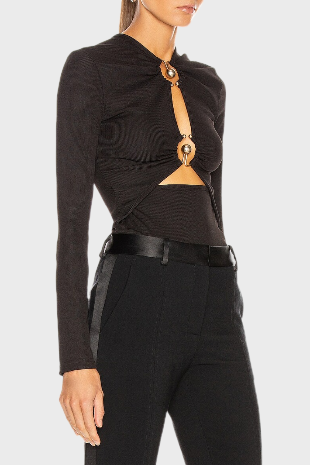 Get playful in our Keelia Cutout Ruched Bodysuit. With a unique cutout design and flattering ruched detailing, this bodysuit is sure to turn heads. The cutout details and bodycon fit accentuate your curves, while the long sleeves provide versatility for any occasion. Show off your style with this eye-catching bodysuit.