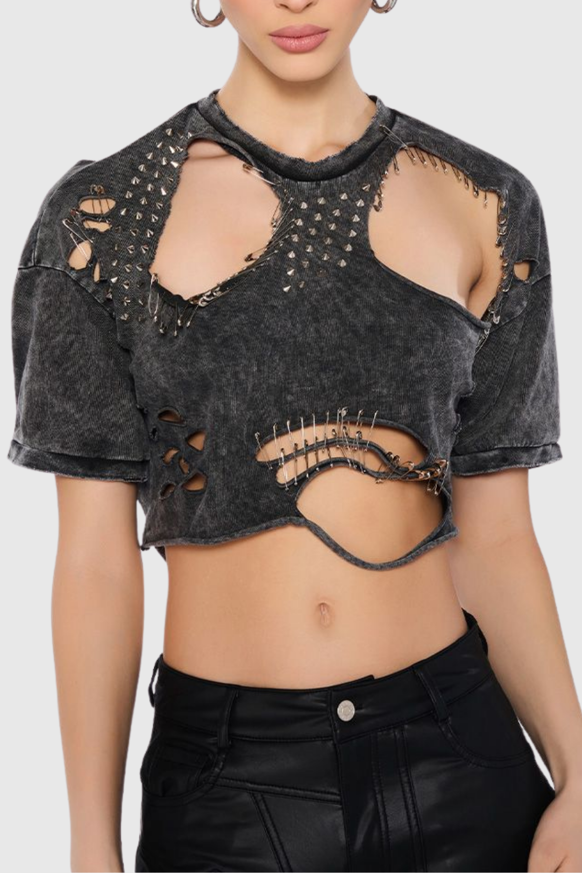 Tune into your rebellious side when you wear Kira Cutout Paperclip Embellished T-shirt in Grey! Complete with ultra-distressed ripped accents, cut out detailing, silver metallic pointed studs, and safety pin embellishments, successfully delivering that sought-after alternative flare. Style with a bralette, relaxed fit denim, and platform sneakers to finish off your look.