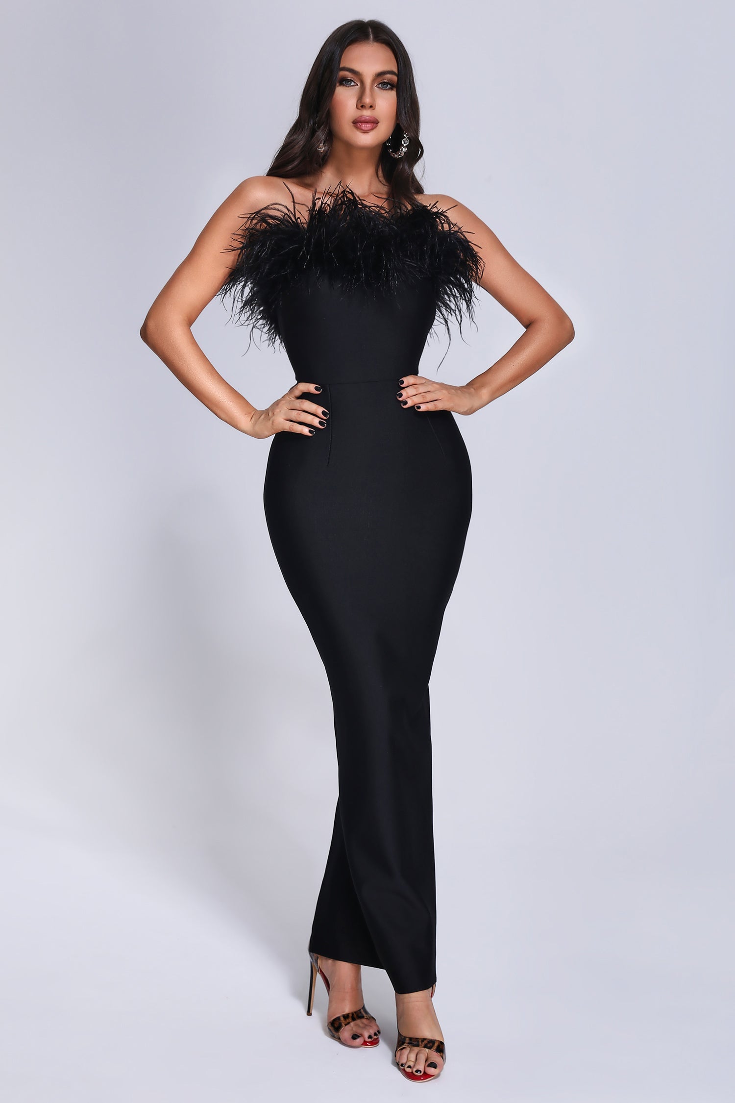 Our Leah Feather Maxi Bandage Dress is sure to wow the crowd at your next special event! Comfortable bandage shapes a seamed, neckline adorned in feather bodice with strapless, while a bodycon maxi skirt hugs your curves below a fitted waist.All black look perfect for showing your power and seduction!