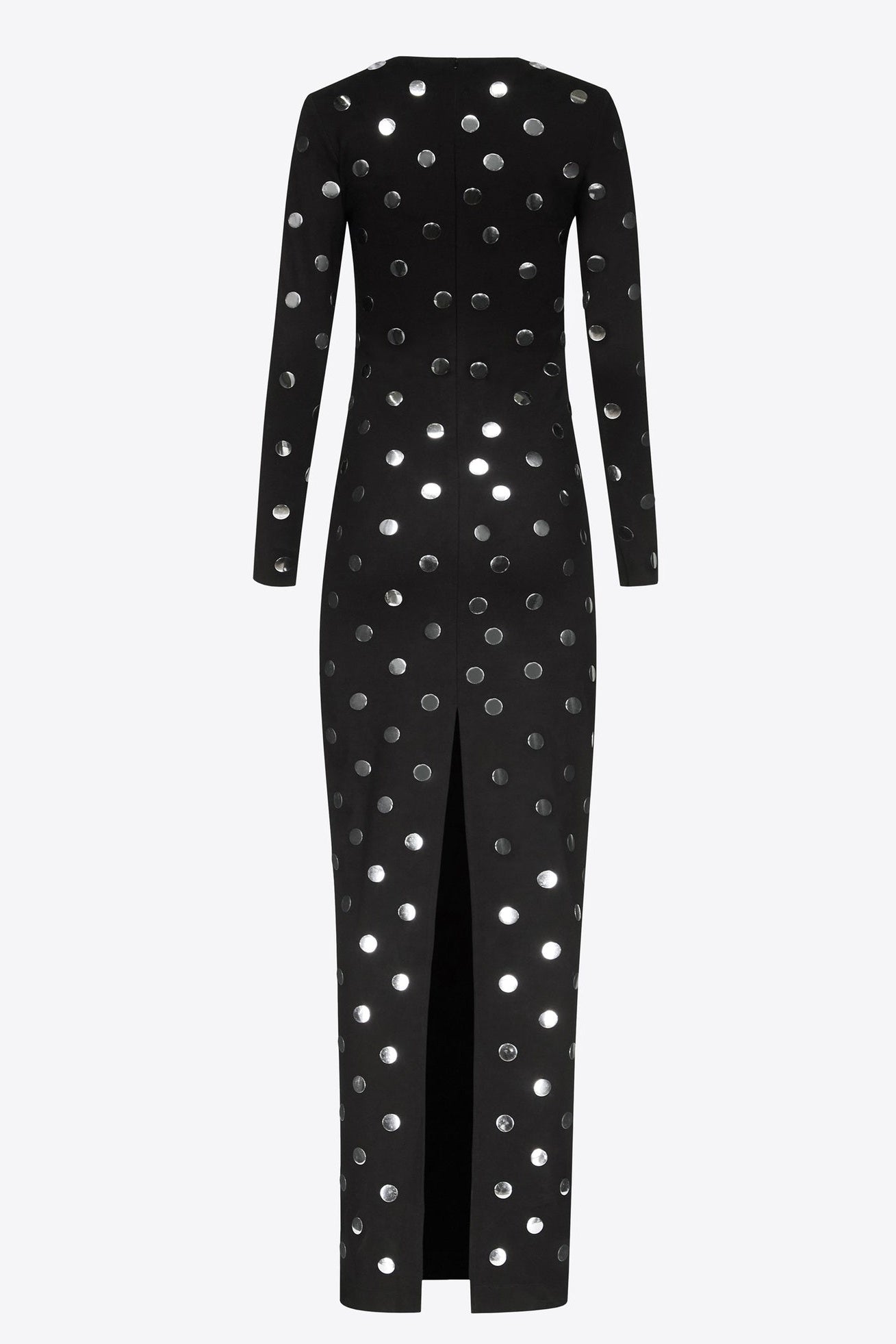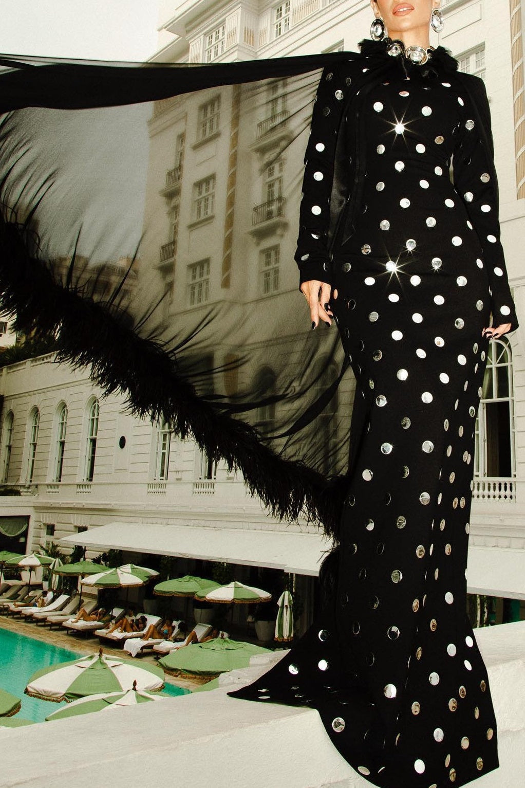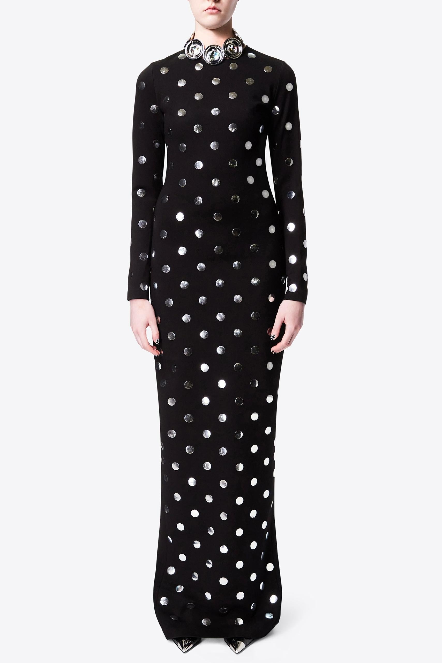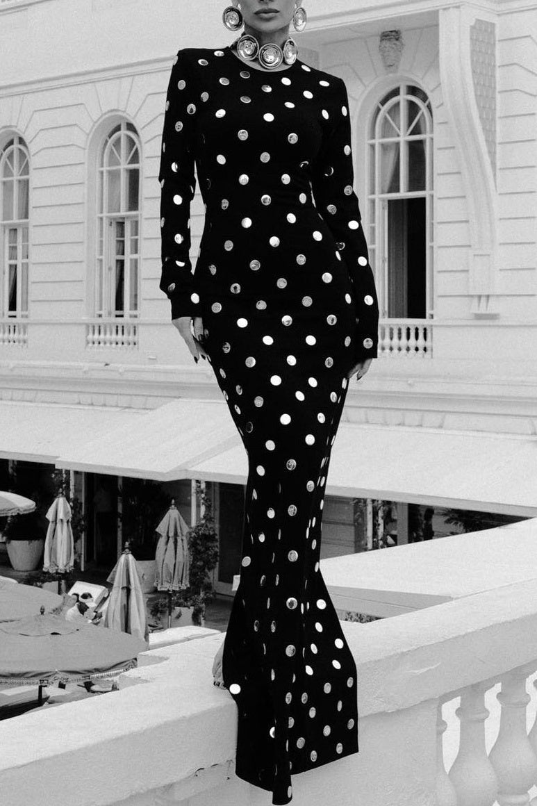 The timeless black color adds sophistication and versatility, allowing for effortless styling. Whether dressed up with heels and accessories or dressed down with flats, this Lexi Mirror Maxi Bandage Dress is the epitome of effortless style and comfort.Compact ponte jersey long sleeve gown featuring polka dot embellishment and hidden back zipper.