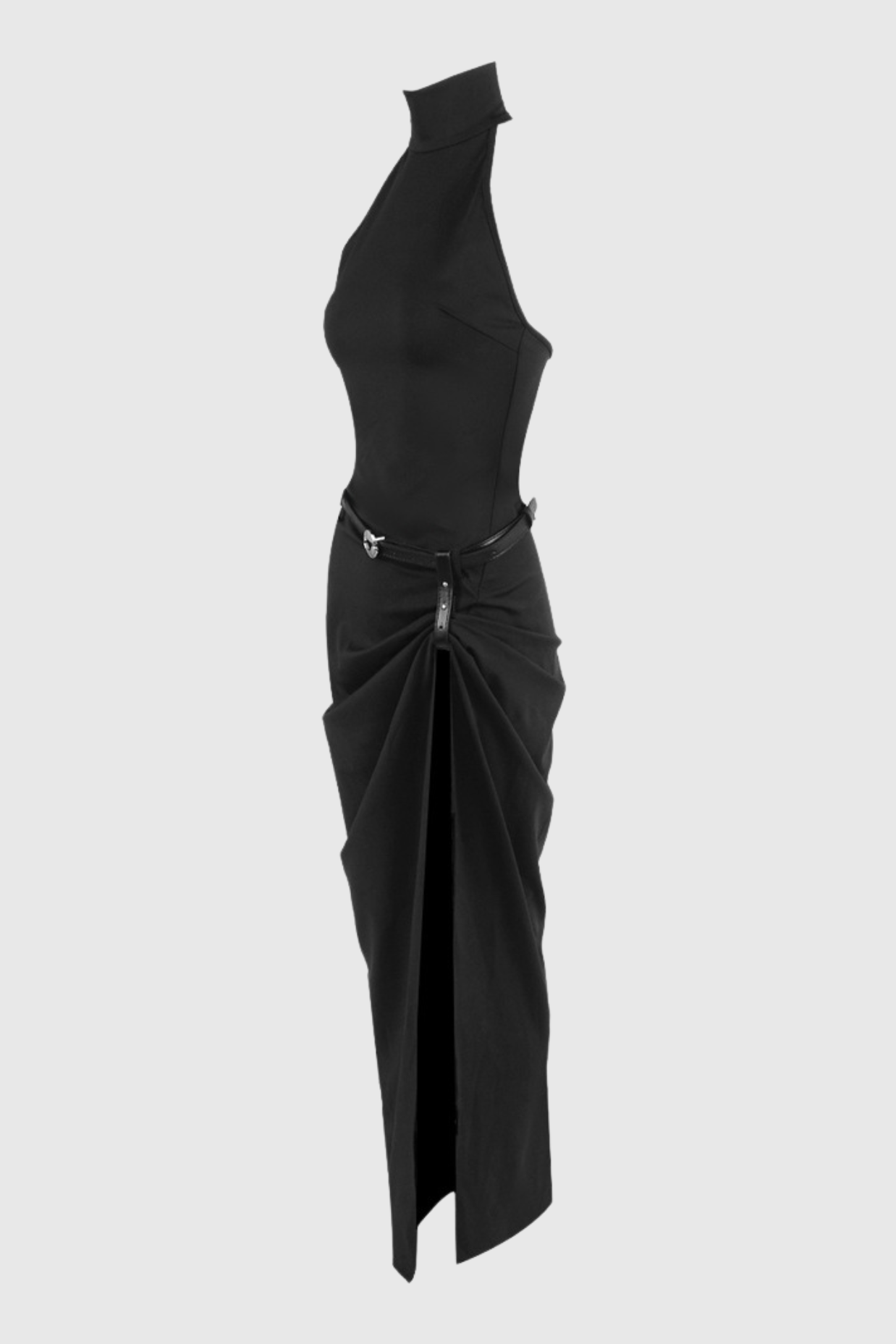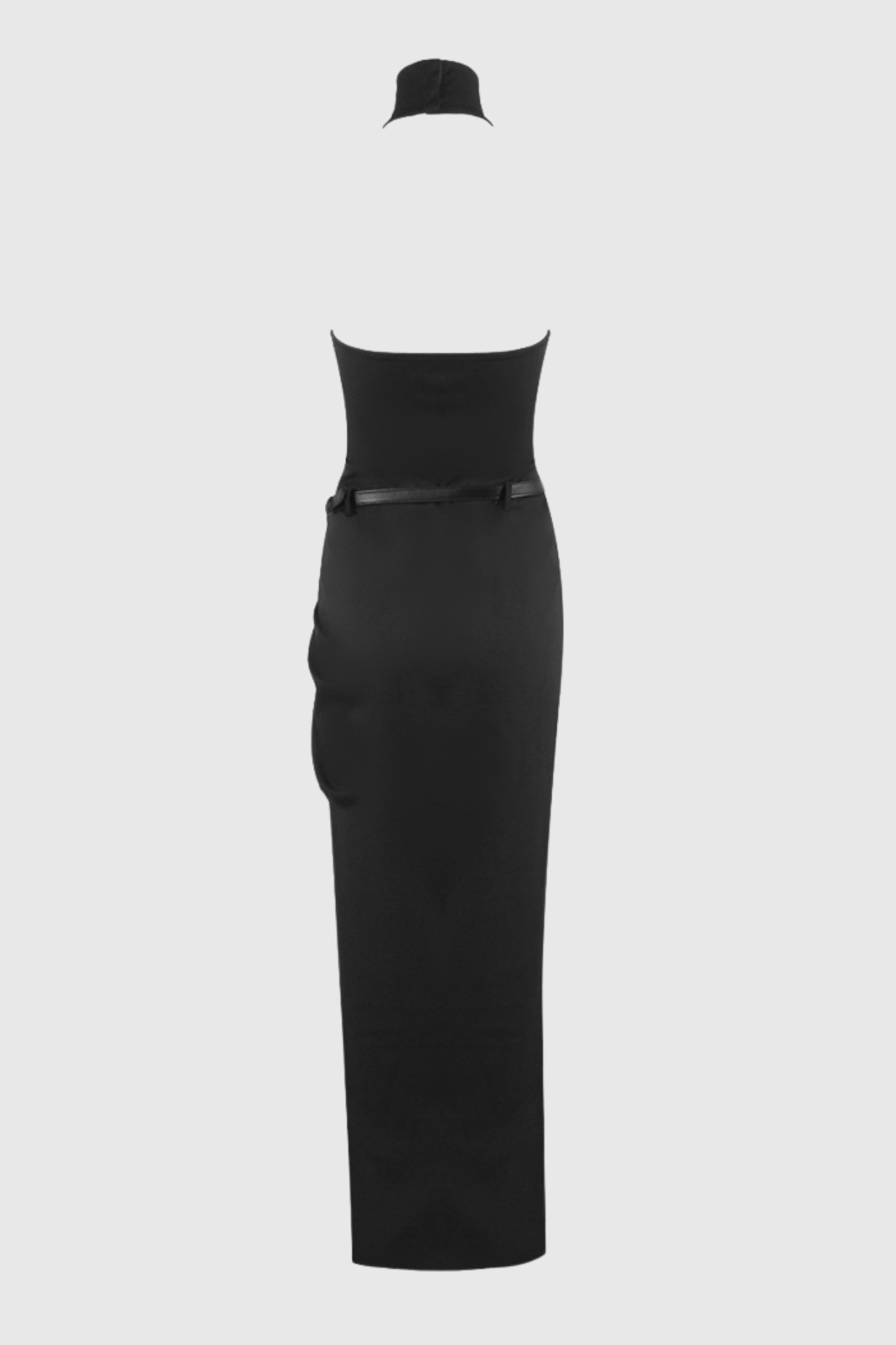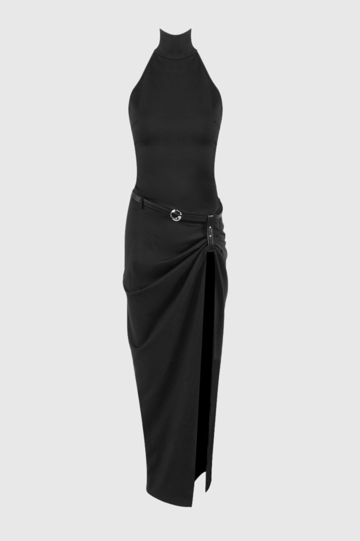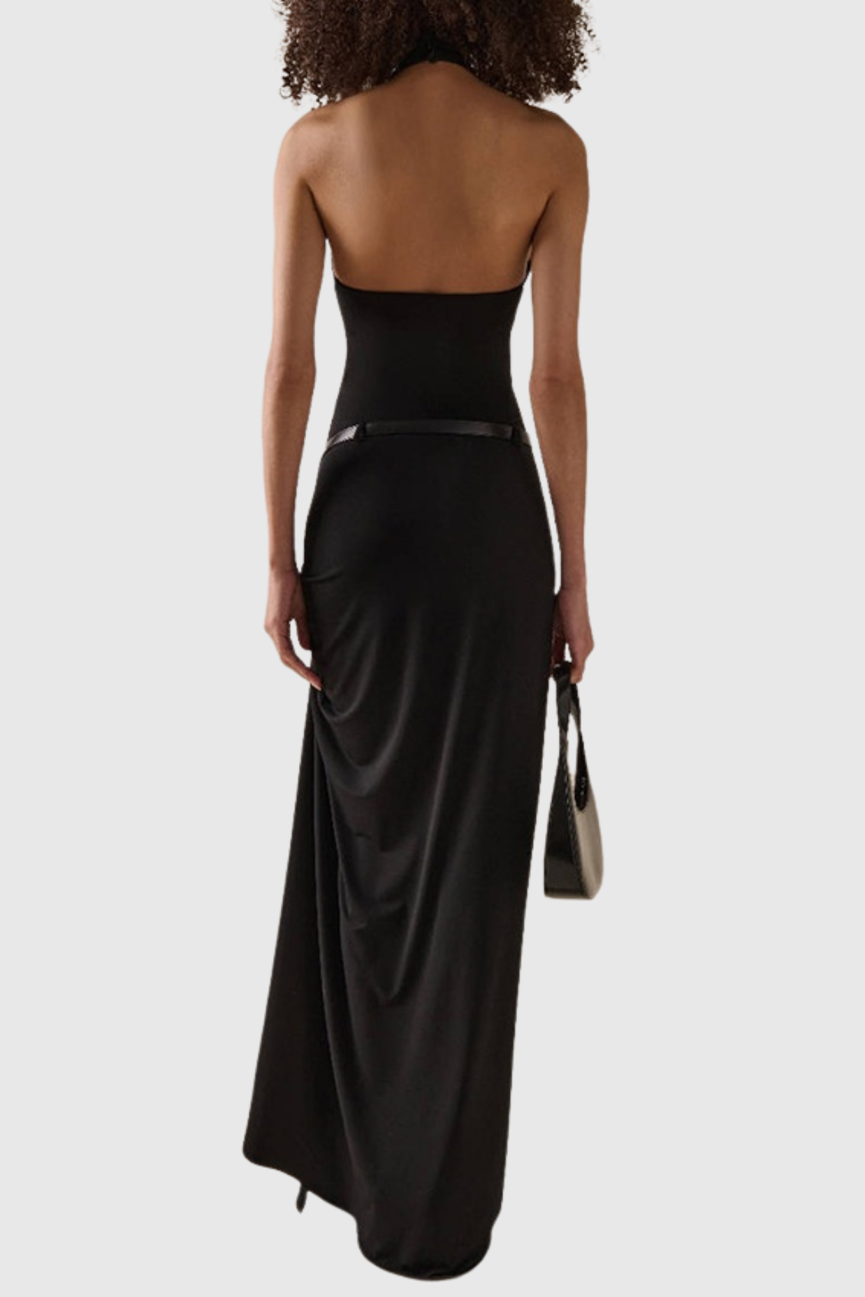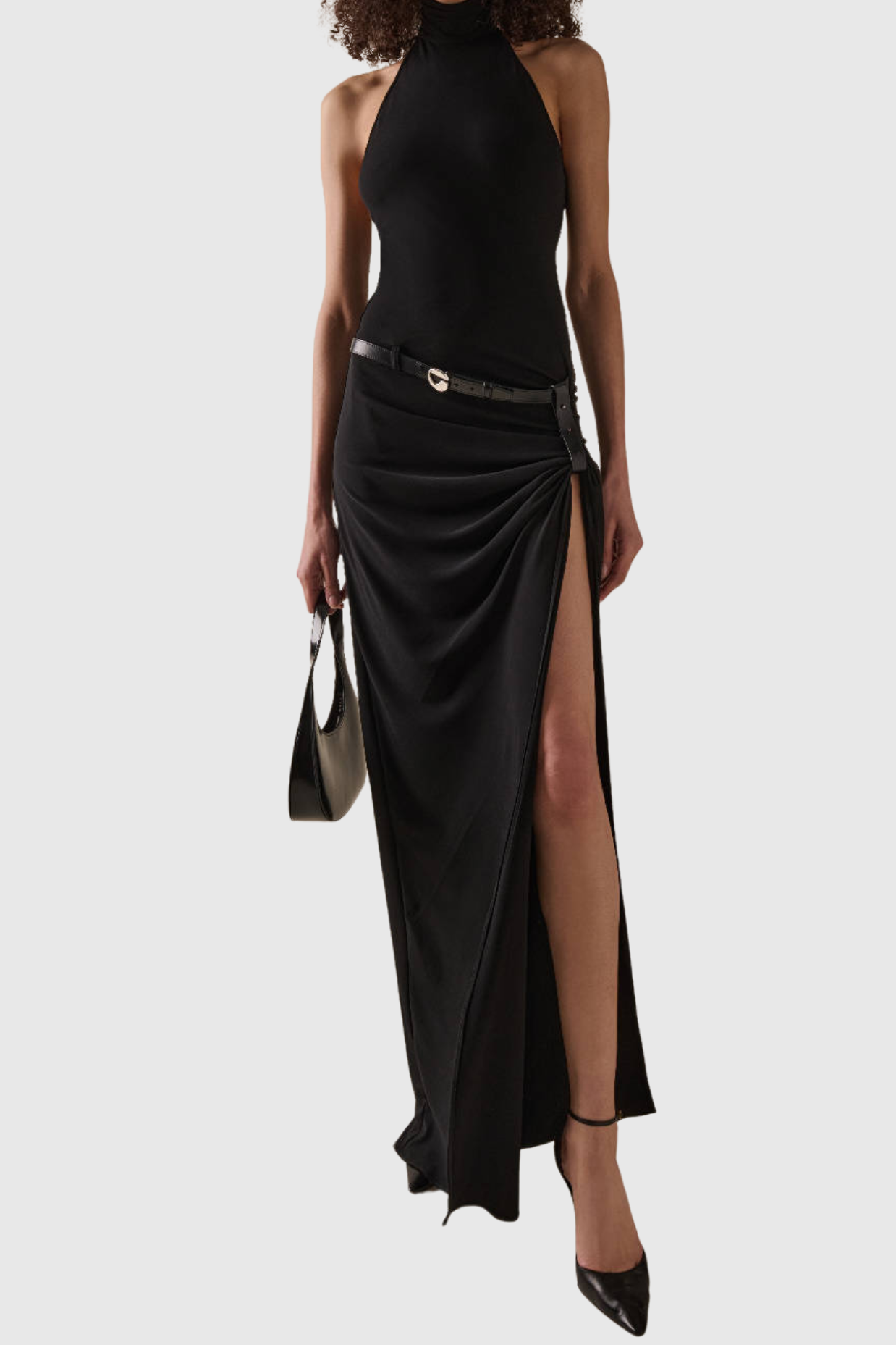 Elevate your wardrobe with the Masha Halter Ruched Belted Split Maxi Dress, a refined choice for any elegant occasion. This dress features a flattering ruched design and a belted waist that accentuates your silhouette, while the halter neckline adds a touch of sophistication. The tasteful split enhances movement and allure, making it perfect for both formal events and stylish evenings out. Experience timeless elegance combined with modern detail in this stunning maxi dress.