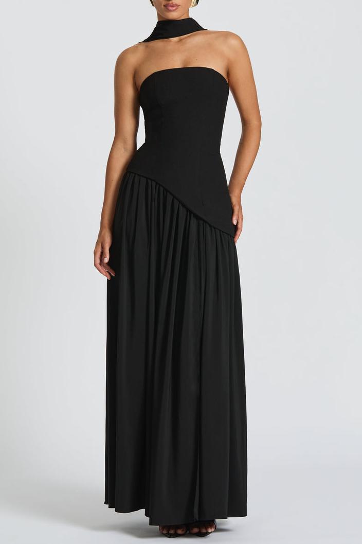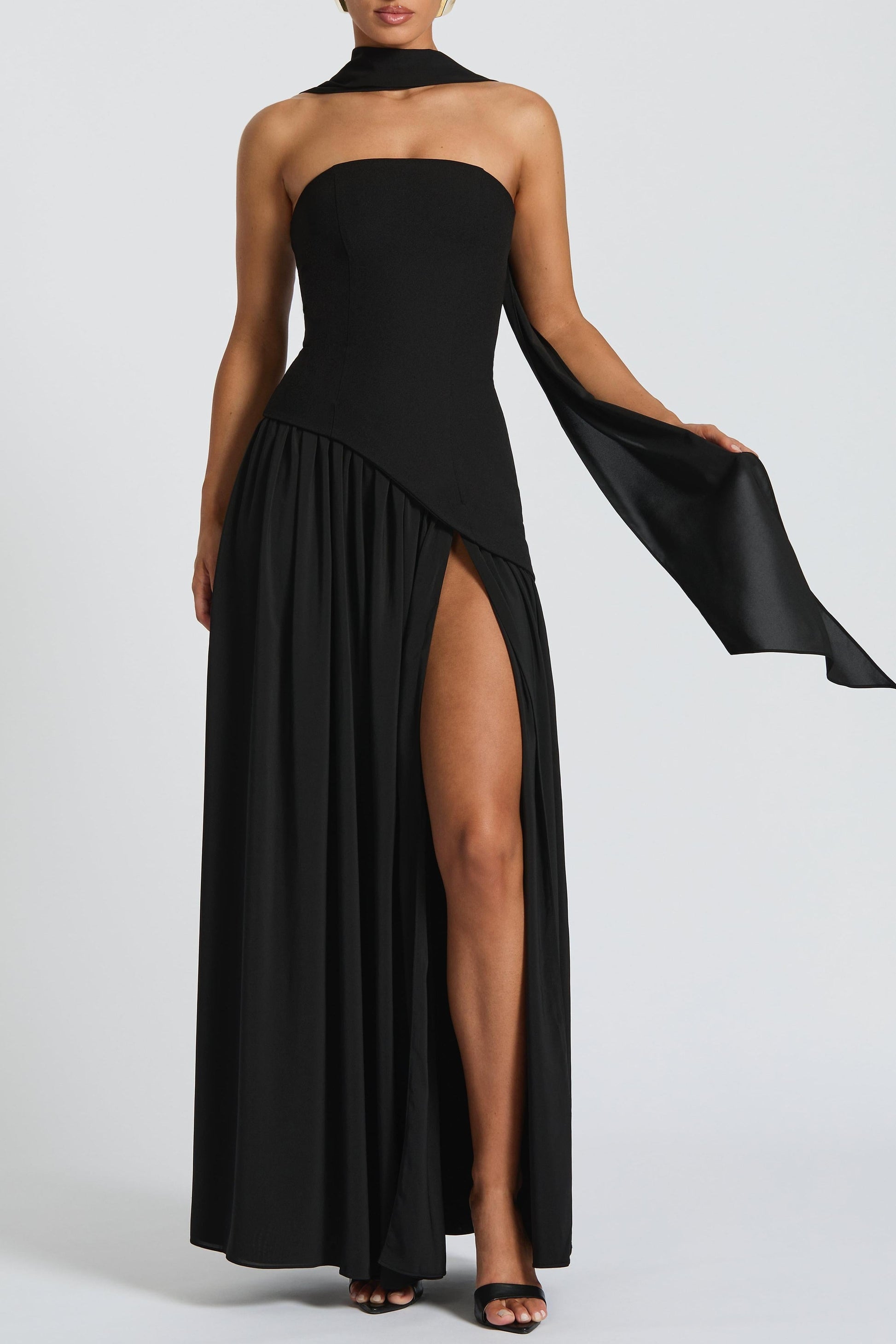 Elevate your eveningwear with the Miloni Strapless Split Maxi Dress, designed for graceful sophistication. This elegant piece features a strapless neckline that accentuates your shoulders, paired with a daring side split that adds movement and allure. Crafted to enhance your silhouette, it offers a refined look perfect for formal events or upscale occasions.