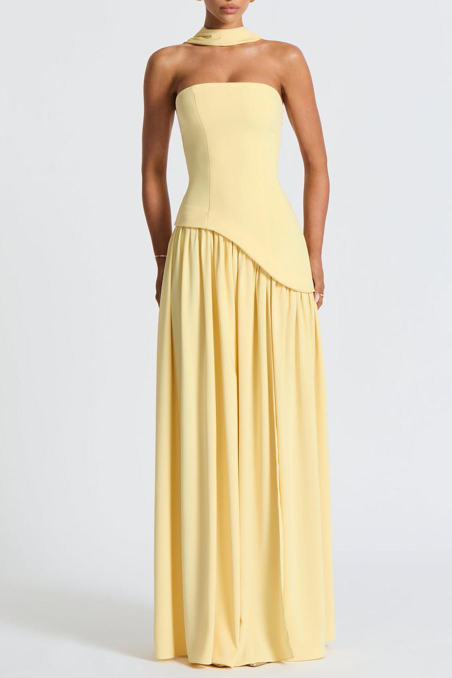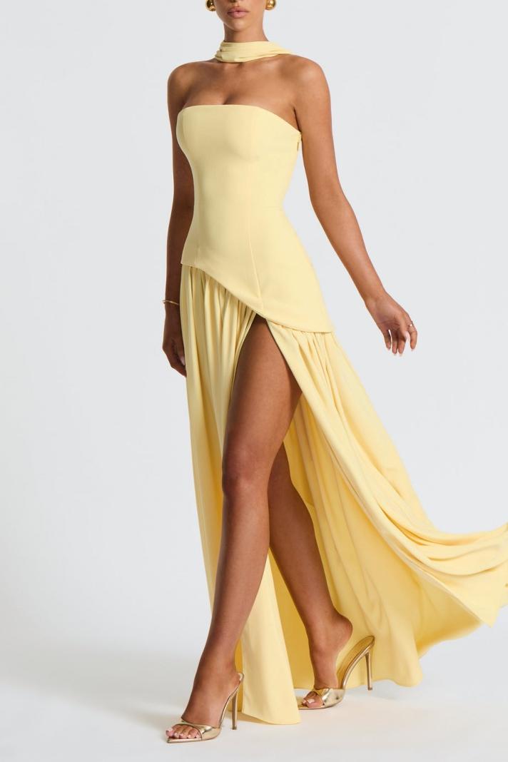 Elevate your eveningwear with the Miloni Strapless Split Maxi Dress, designed for graceful sophistication. This elegant piece features a strapless neckline that accentuates your shoulders, paired with a daring side split that adds movement and allure. Crafted to enhance your silhouette, it offers a refined look perfect for formal events or upscale occasions.