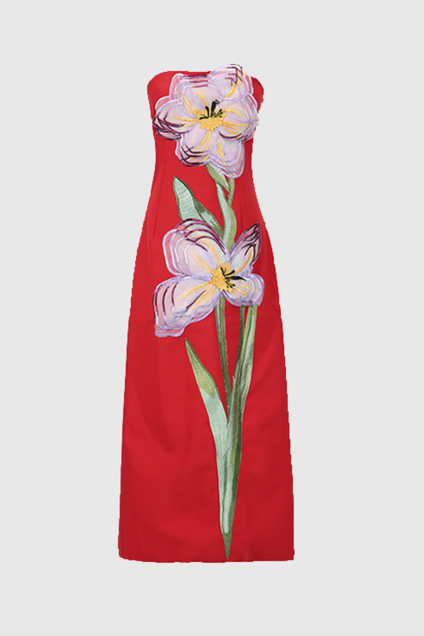 Mimoza Floral Appliqué Strapless Midi Dress - Red