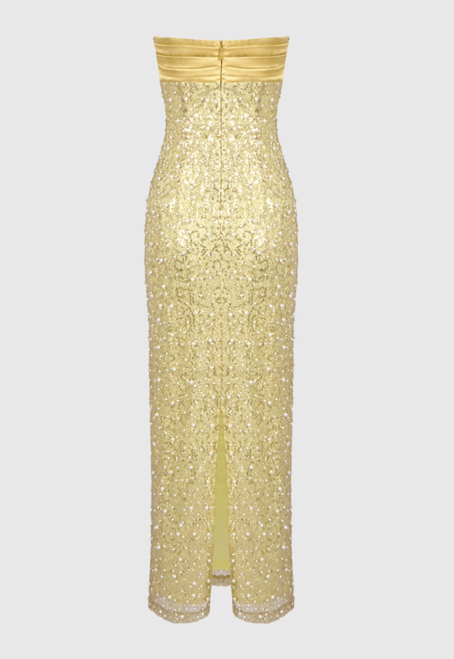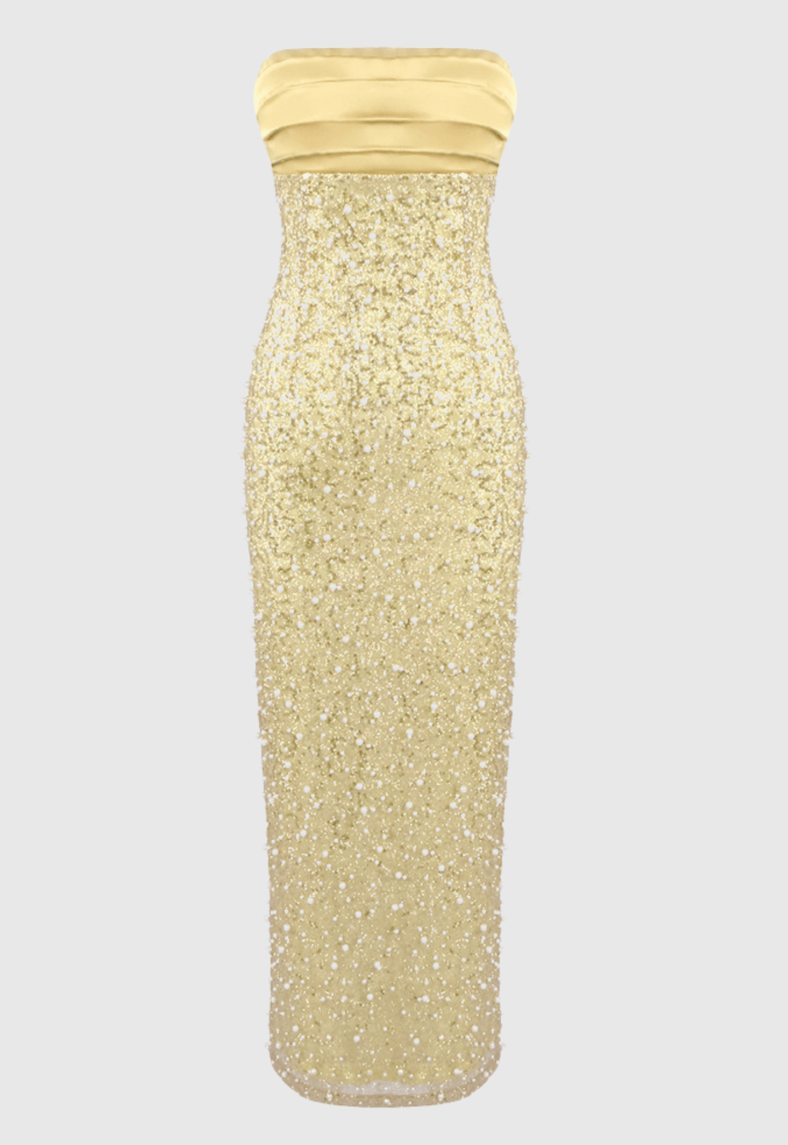 Nilsson Gold Satin Strapless Sequin Pearl Embellished Maxi Dress