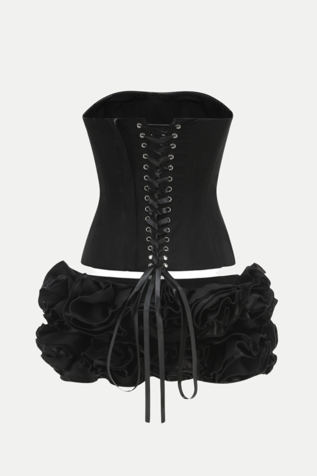 Indulge in the sophisticated and exclusive style of the Nuala Floral Lace Up Two Piece Set. This luxurious set features a flora design and a lace-up detail, adding a sensual touch to your look. Perfect for a night out or a special occasion, this set will make you feel elegant and glamorous.