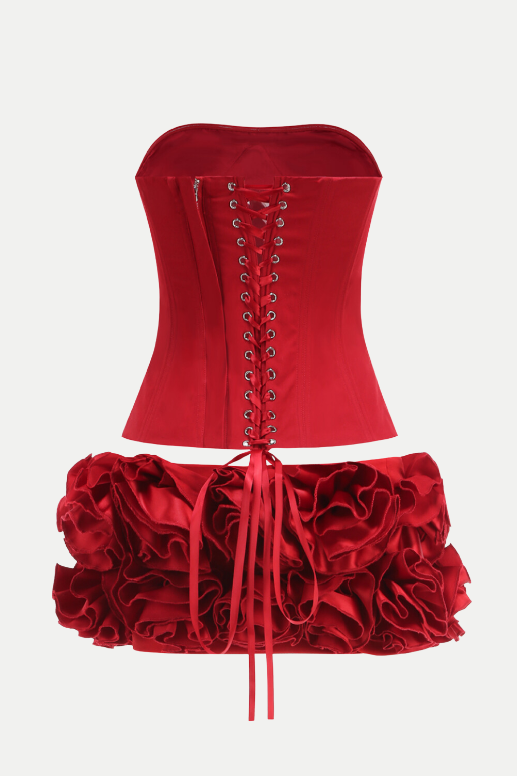 Indulge in the sophisticated and exclusive style of the Nuala Floral Lace Up Two Piece Set. This luxurious set features a flora design and a lace-up detail, adding a sensual touch to your look. Perfect for a night out or a special occasion, this set will make you feel elegant and glamorous.