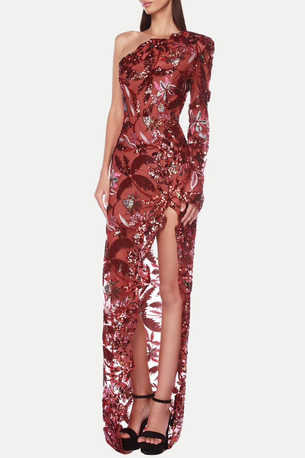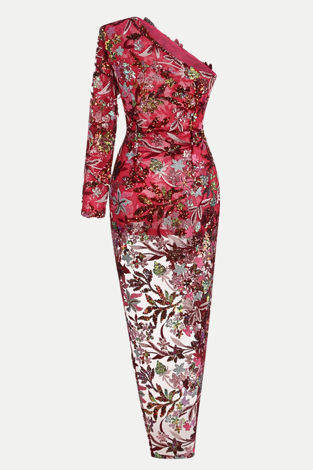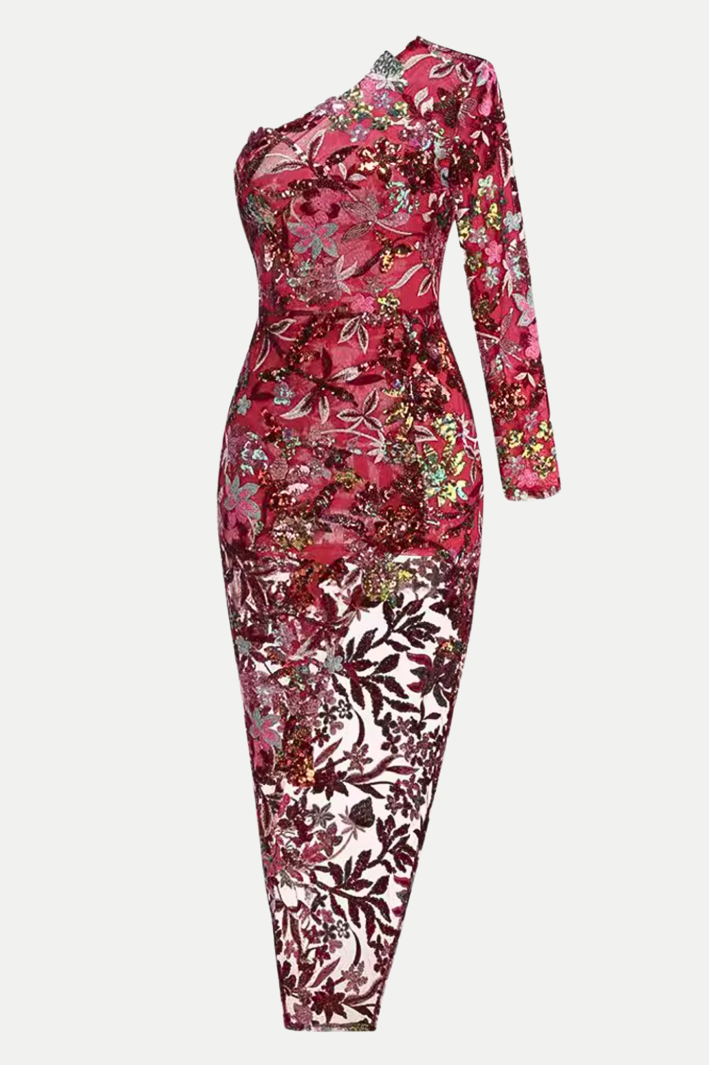 Indulge in opulence with our one-shoulder midi dress adorned in shimmering floral sequin embroidery. Perfect for any special occasion, this dress exudes sophistication and elegance. With its unique and luxurious design, you are sure to make a statement and turn heads wherever you go.