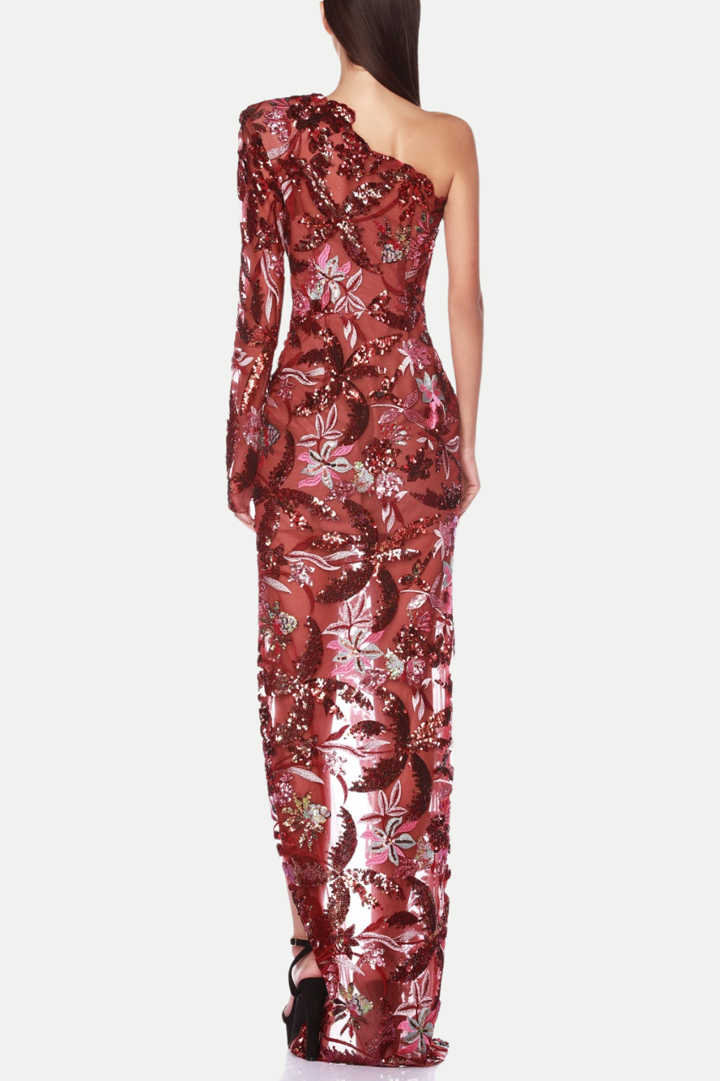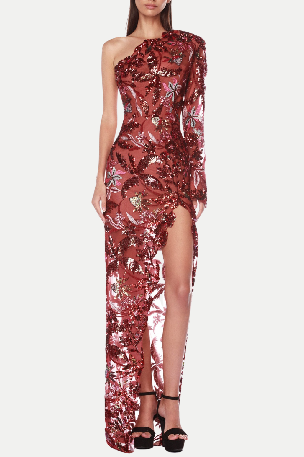 Opal Floral Sequin Embroidered One Shoulder Midi Dress - Red