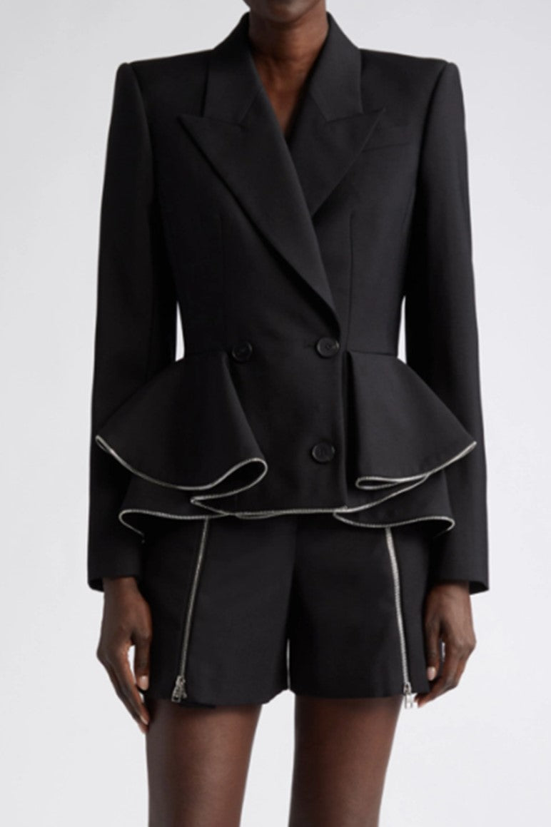 Elevate your style with our Pamely Peplum Ruffle Blazer! This statement piece boasts a flattering peplum design and playful ruffle detailing. Perfect for adding a touch of femininity and sophistication to any outfit. Take your wardrobe to the next level with our Pamely Blazer!