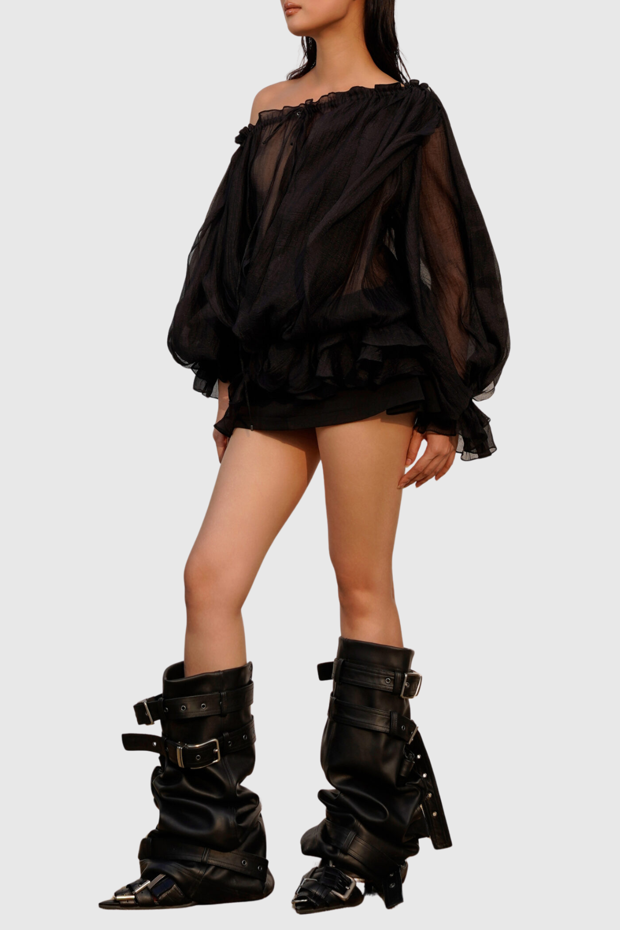 Pineda Off Shoulder Ruched Ruffle Blouse - Black