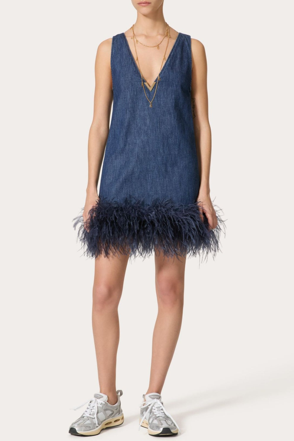 Poppa Feather Trim Denim Mini Dress
