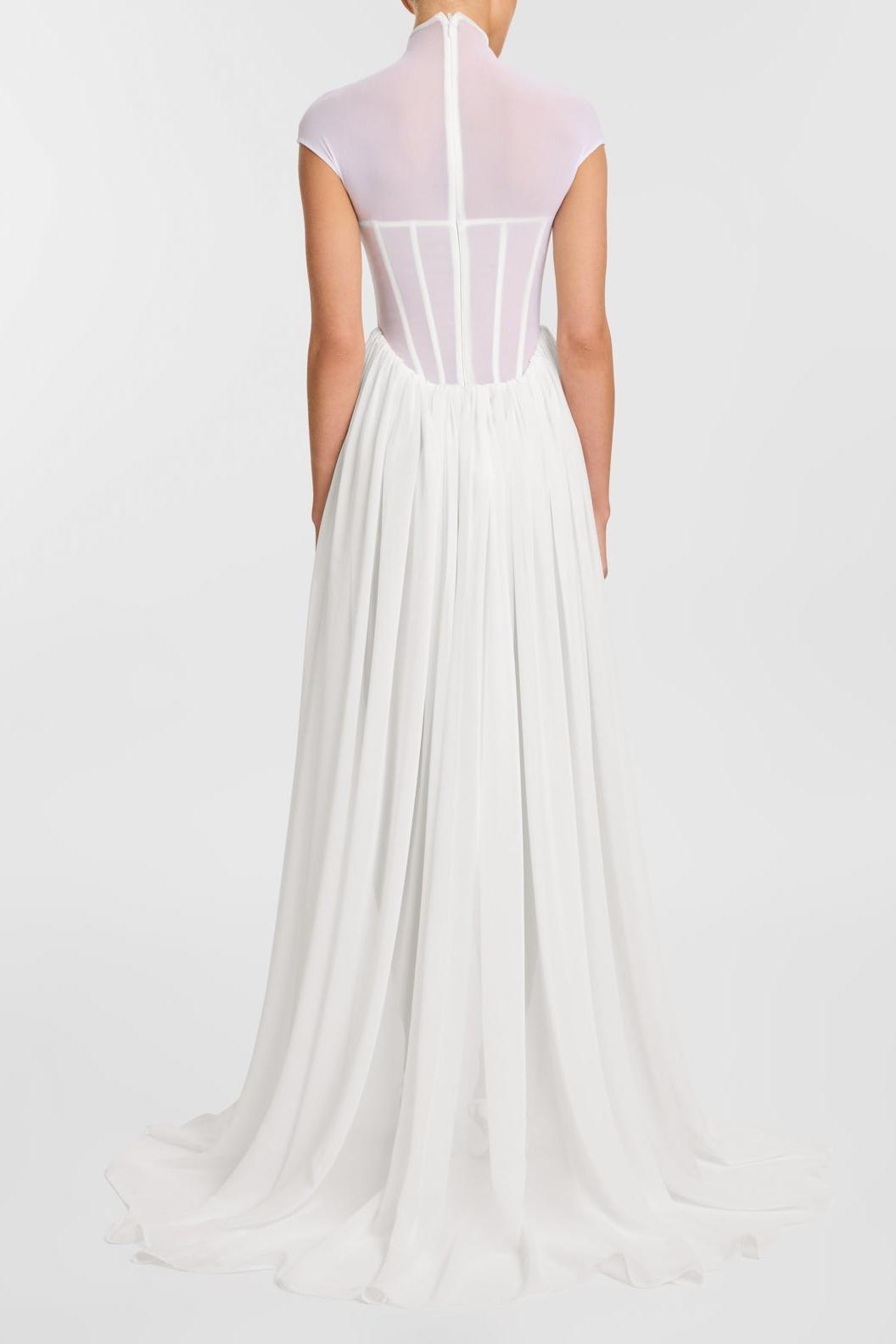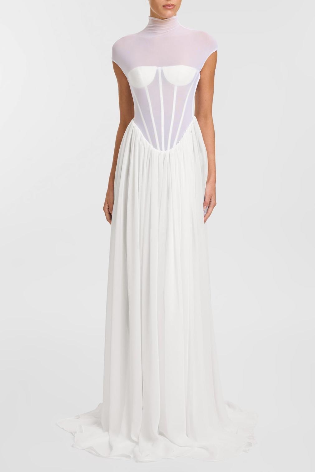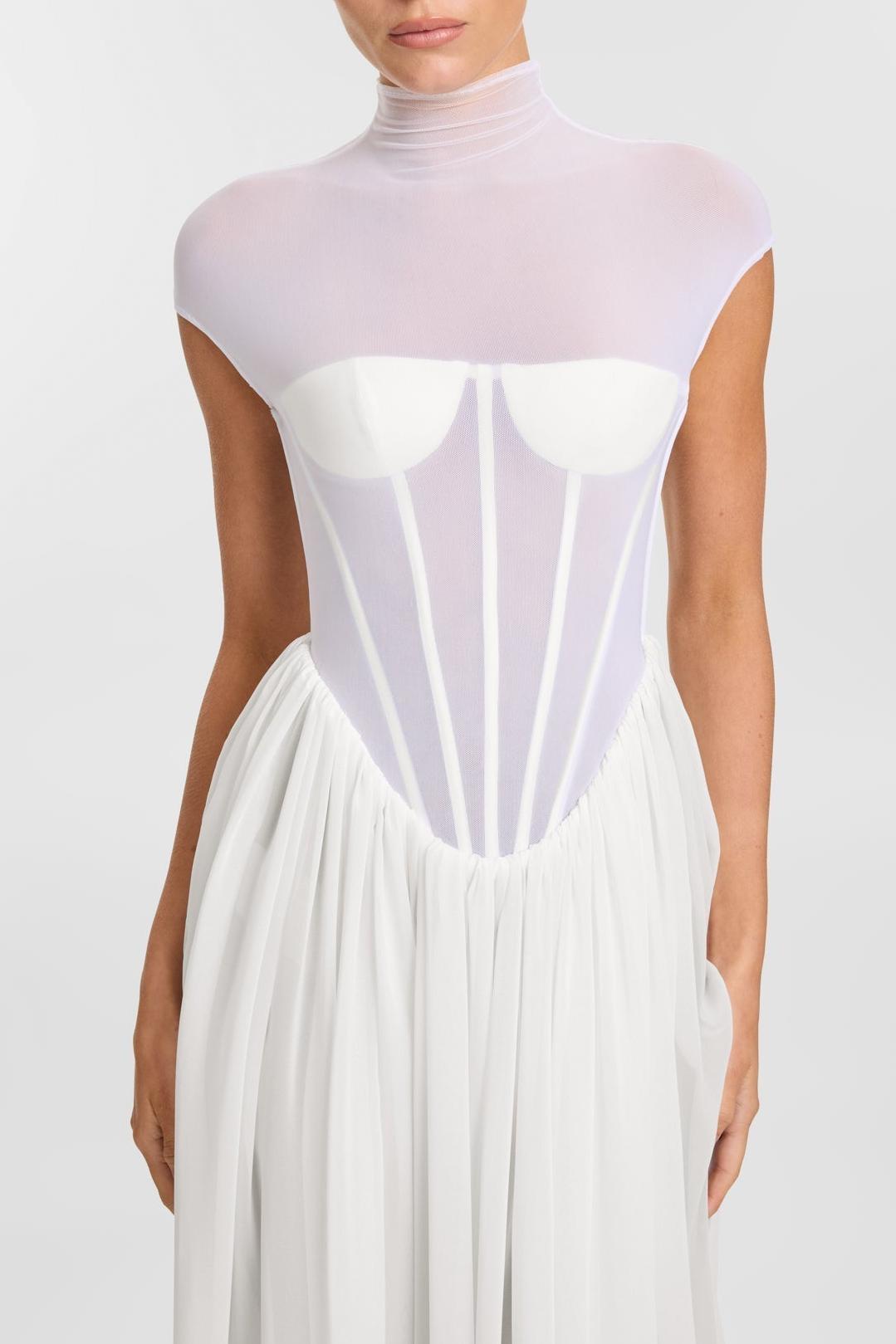 Elevate your evening with the Rosara Corset Mesh Maxi Dress, where delicate mesh overlays a structured corset silhouette for a refined, modern look. This floor-length dress contours your figure gracefully, offering a blend of elegance and allure perfect for sophisticated occasions. Its breathable mesh fabric ensures comfort while maintaining an effortlessly chic presence.