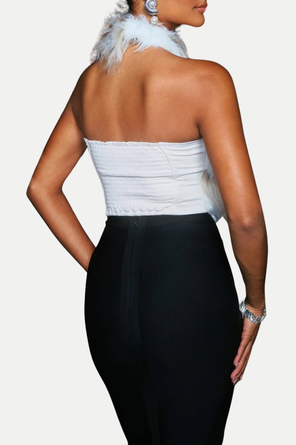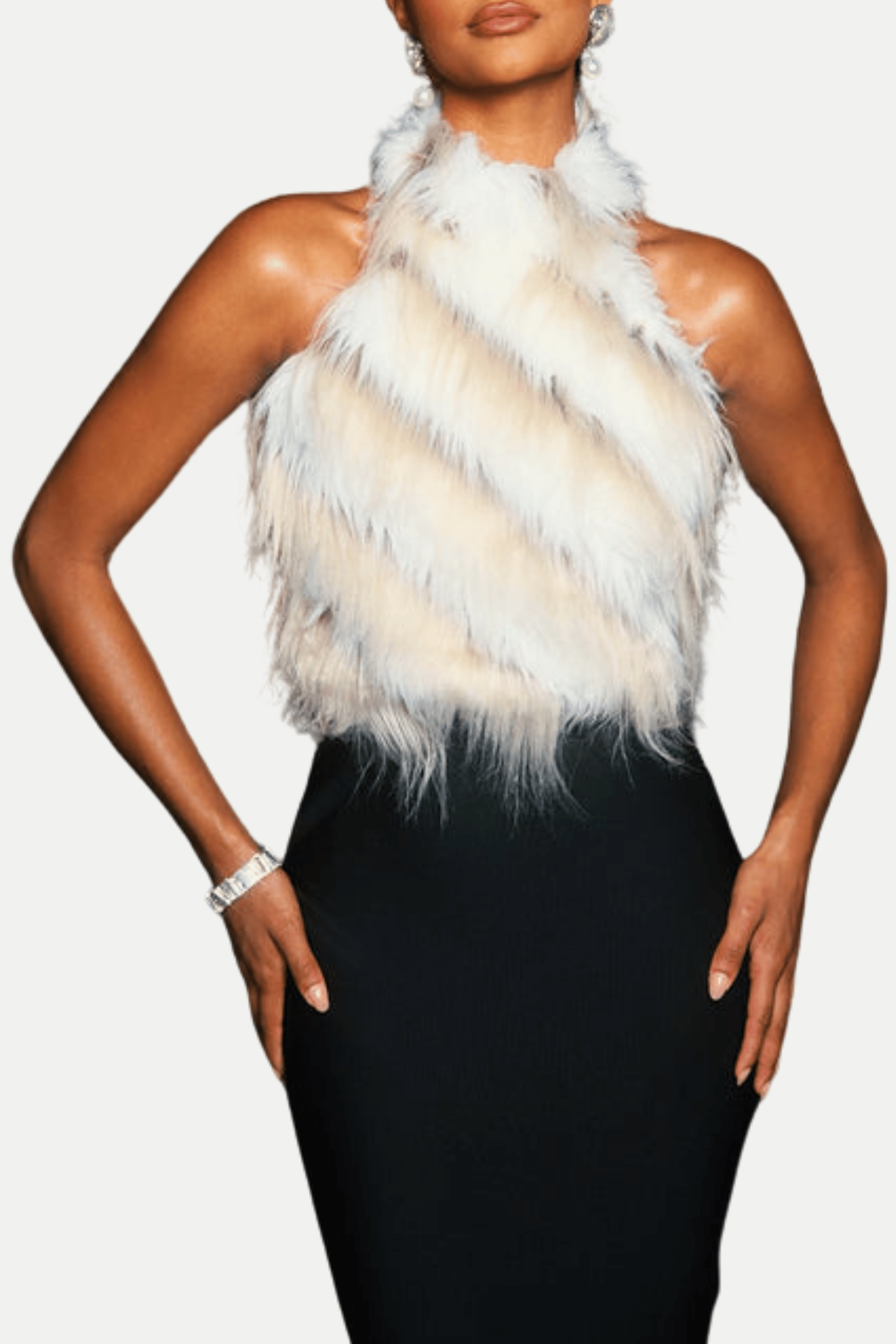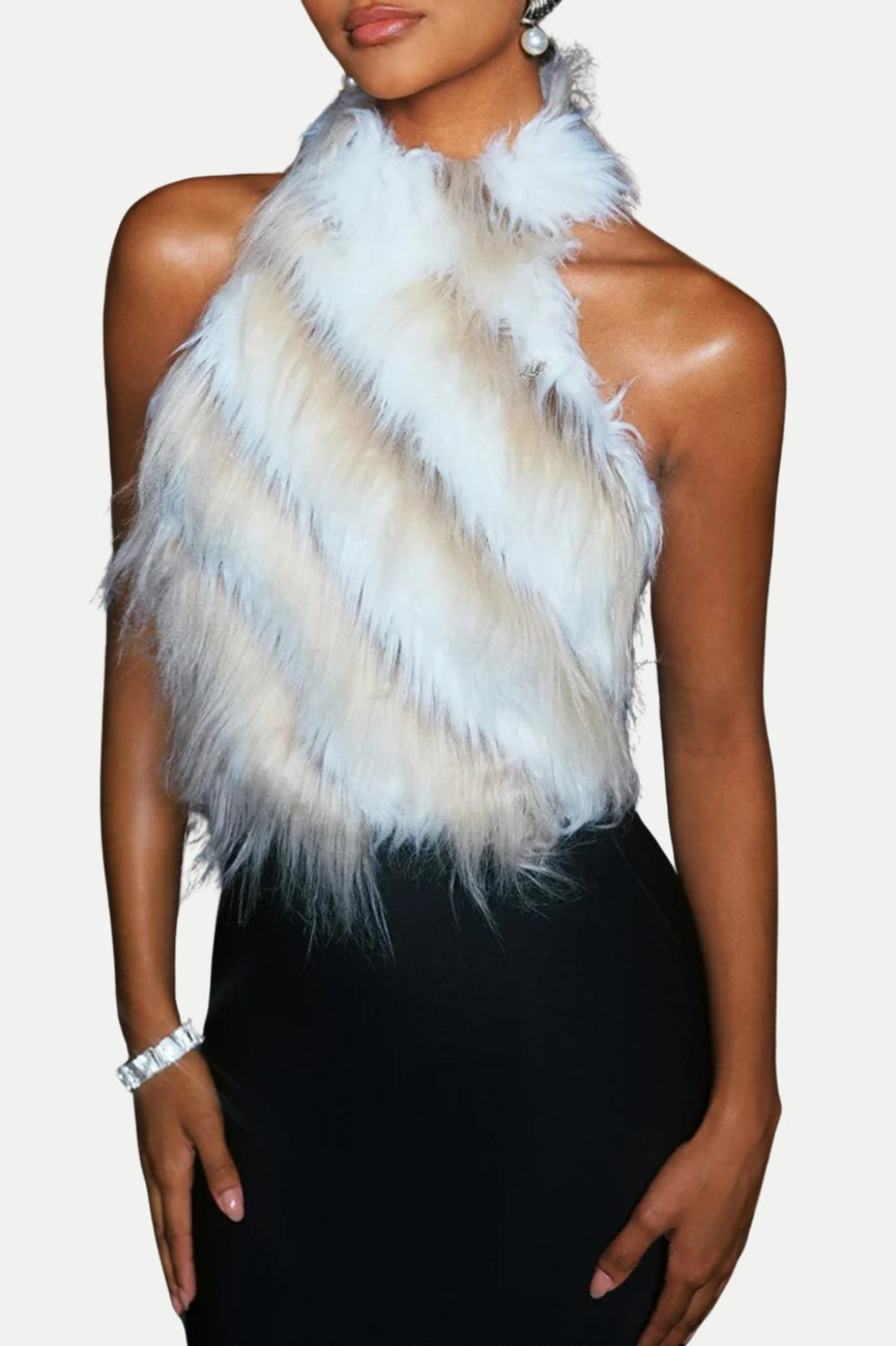 Unleash your wild side with the Rossetti Faux Fur Halter Top. Made with soft faux fur, this top adds a daring touch to any outfit. Elevate your style and stand out from the crowd. Take on any challenge and show your fearless fashion sense with this statement piece!