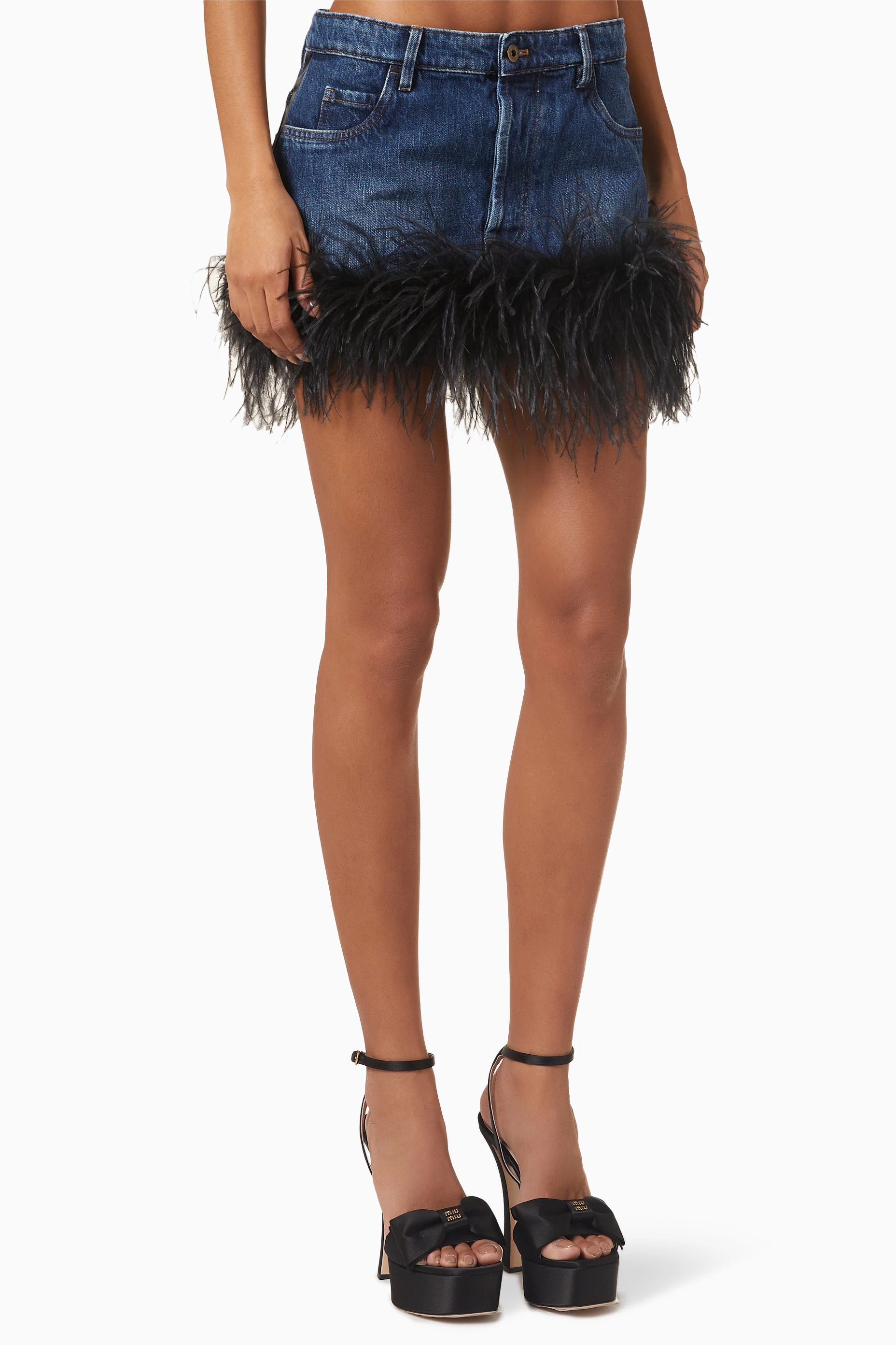 Expertly crafted with a unique feather trim, the Ruth Feather Denim Skirt adds a touch of luxury to your everyday wardrobe. Made from high-quality denim, this skirt offers both durability and style. Elevate your look with this one-of-a-kind piece.