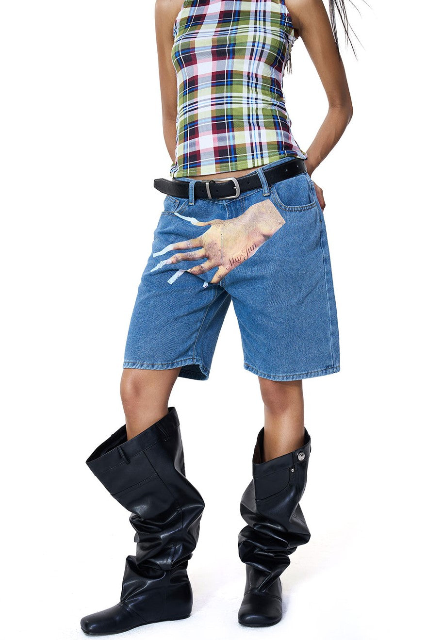 Get ready for playful finger print design and a trendy y2k style with our Sarai Printed Denim Shorts! These quirky and playful shorts feature a unique finger print design, adding a touch of fun to your summer wardrobe. Made from high-quality denim, these shorts offer both style and comfort. So go ahead, slip into these shorts and make a statement!