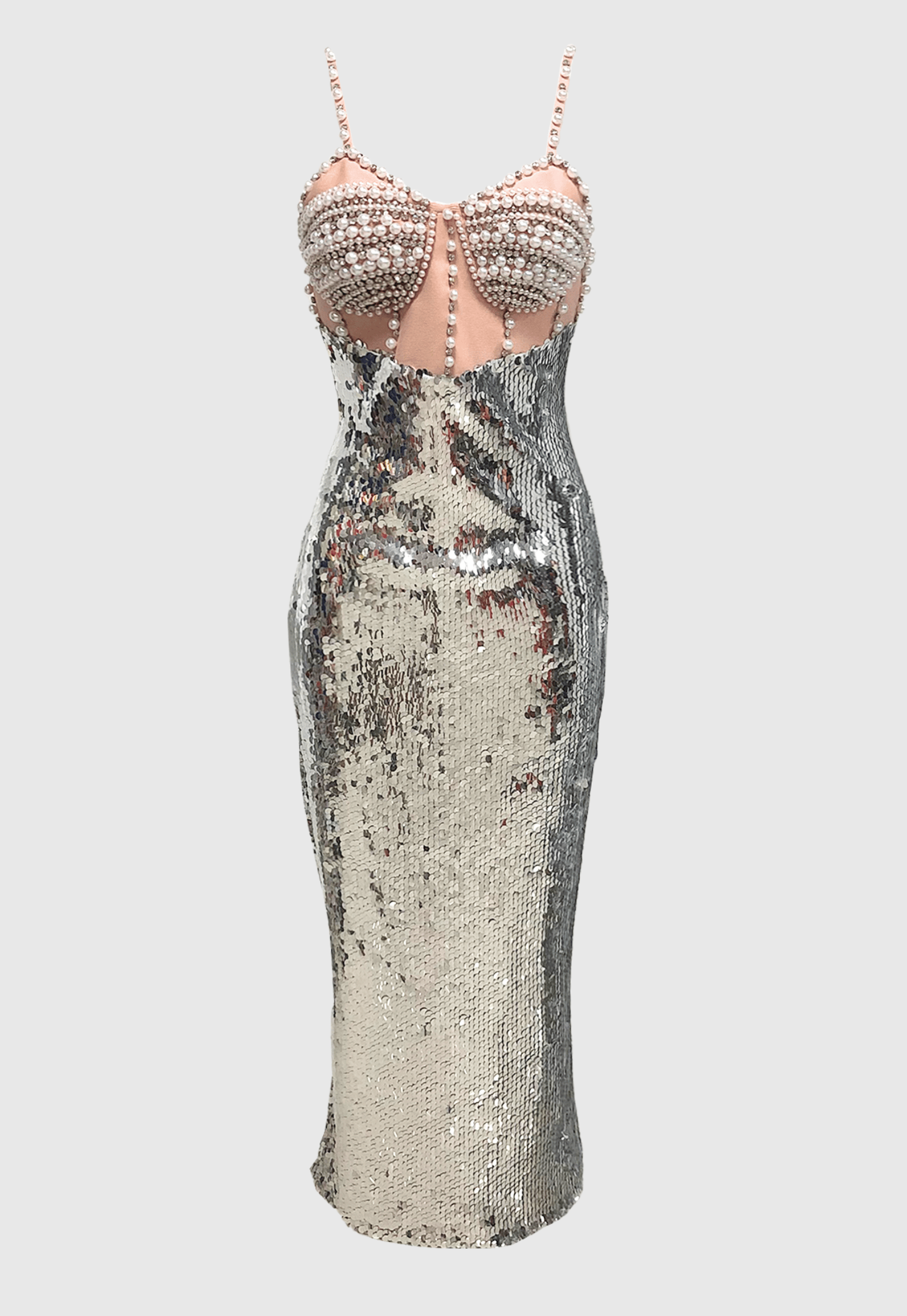 Unleash your daring side with the Sibilia Sequin Pearl Embeliished Midi Bandage Dress. Made with intricate sequin and pearl embellishments, this dress will have you standing out from the crowd. Show off your boldness and confidence in this daring and luxurious dress!