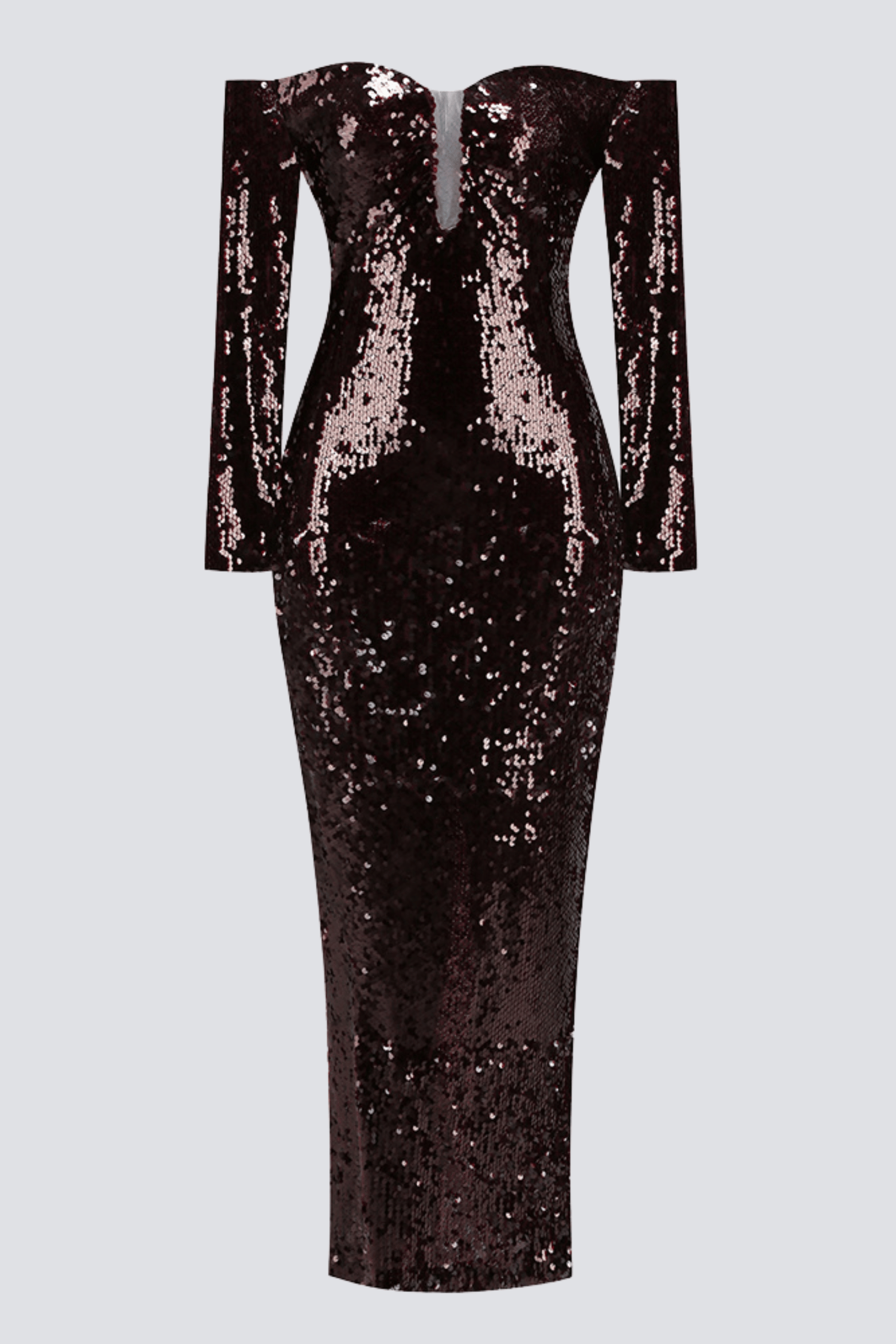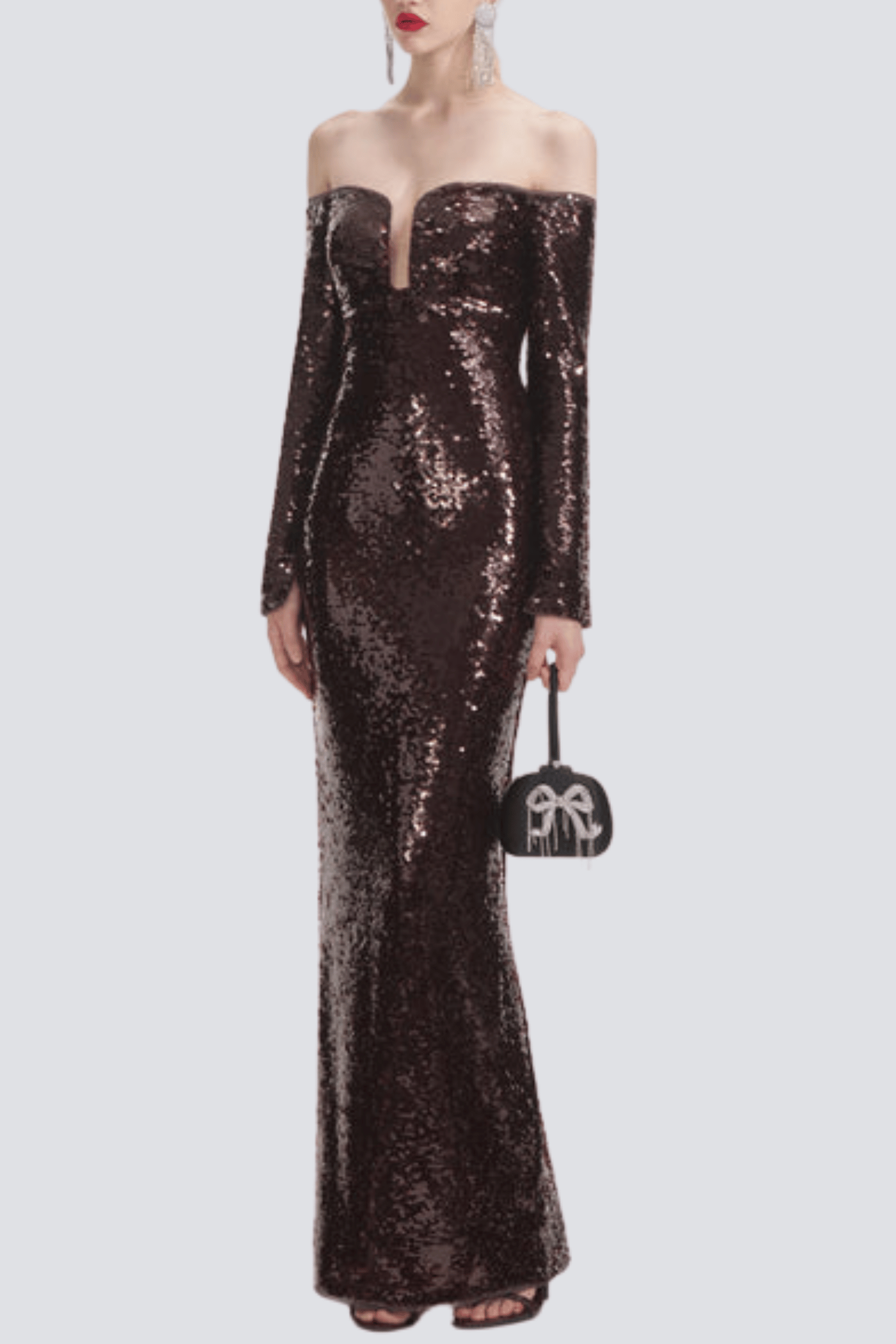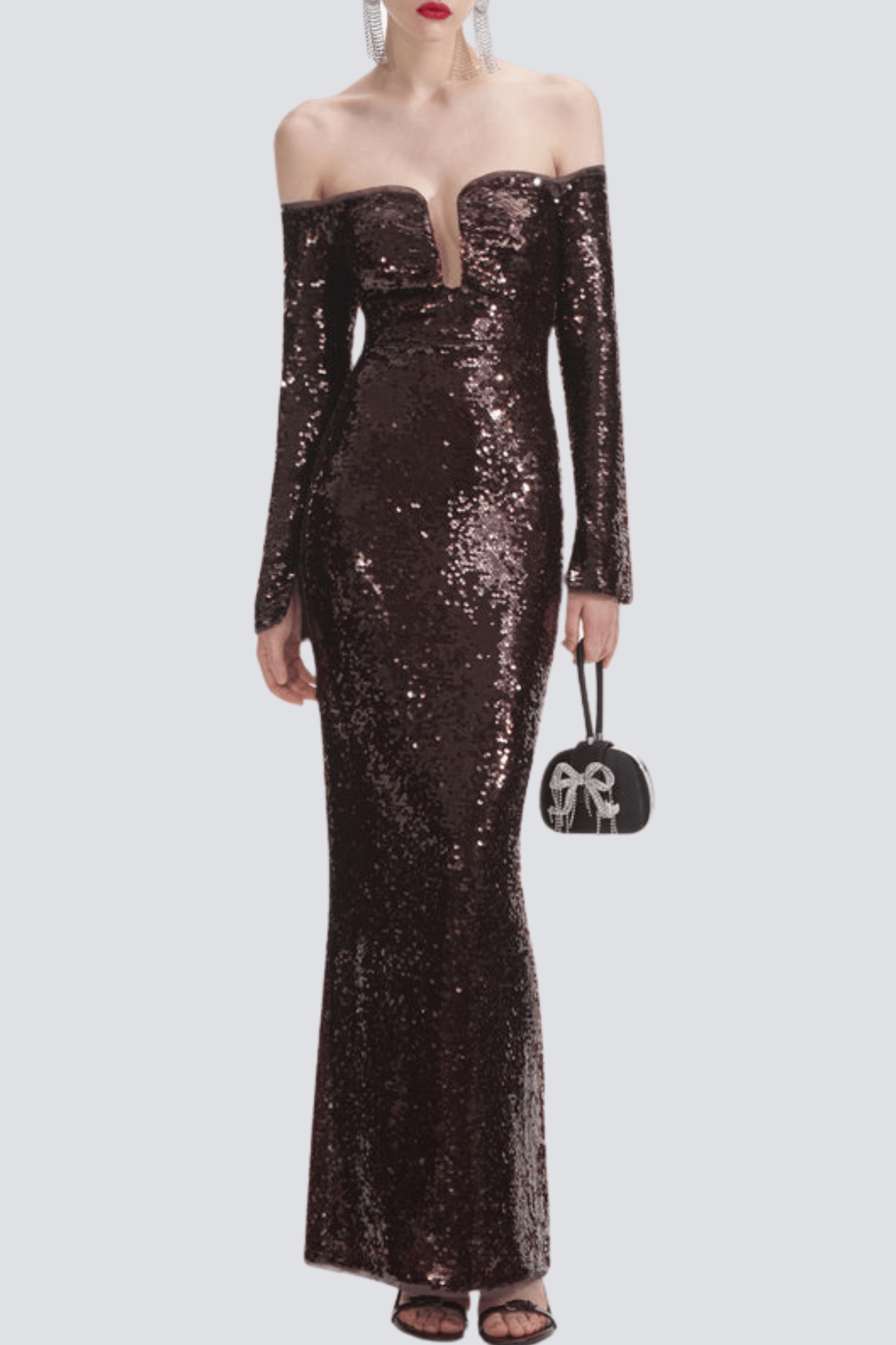 Indulge in luxurious elegance with the Solvay Sequin Off Shoulder Maxi Dress. Featuring a stunning off-shoulder design and intricate sequin detailing, this dress exudes sophistication and exclusivity. The perfect choice for your next special occasion, it will make you feel like a true work of art.