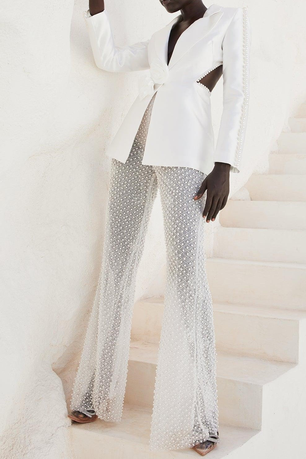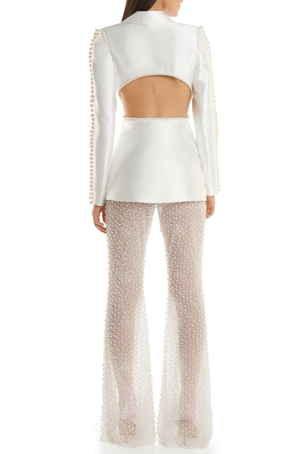 Indulge in luxury with our Tanith Floral Pearl Backless Blazer Set. With its intricate floral design and elegant pearl back detail, this blazer set is perfect for any sophisticated occasion. Make a statement and exude exclusivity with this tasteful and opulent piece.