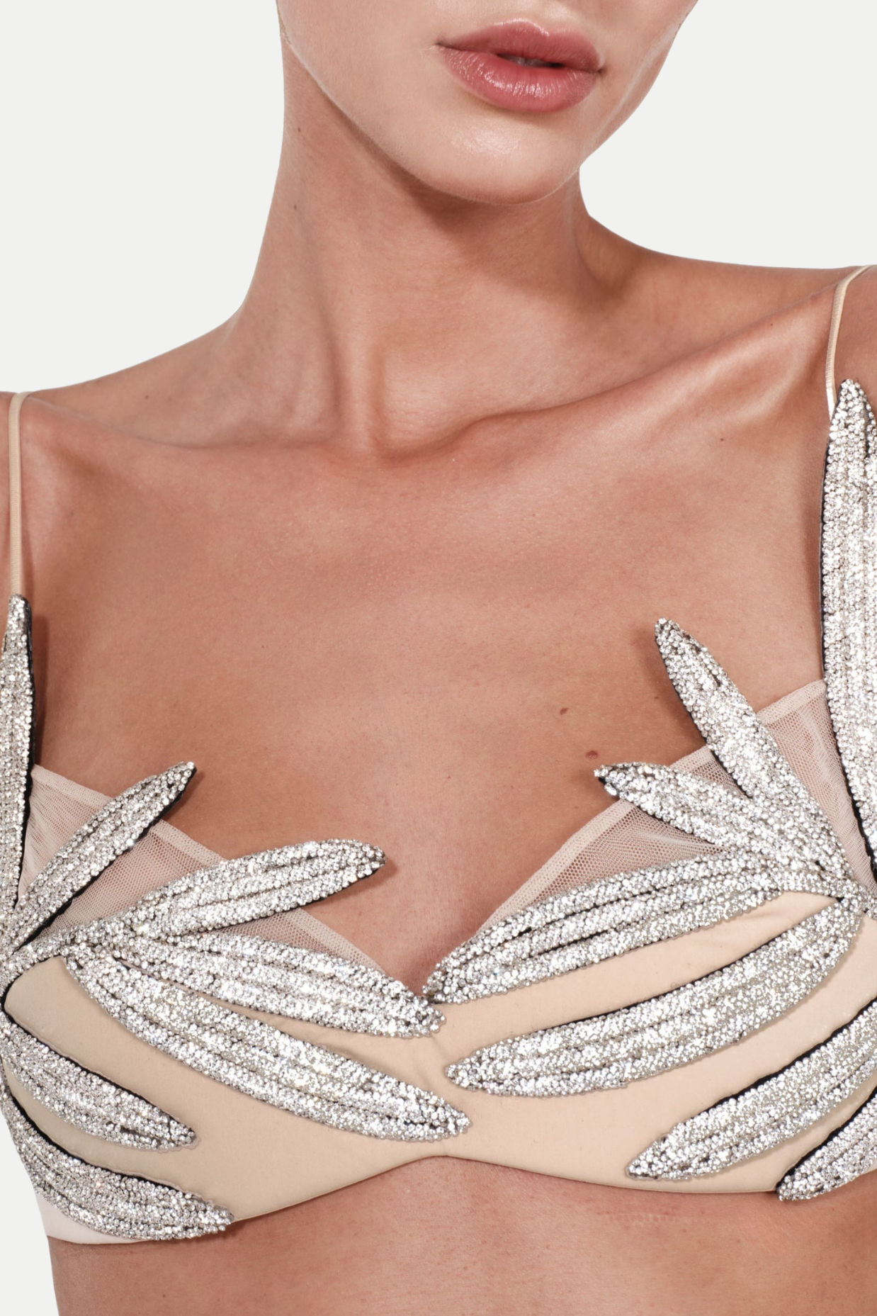 Effortlessly elegant, the Vieby Leaf Crystal Bralette is a must-have for any fashion-forward individual. Adorned with dazzling crystals, this bralette is perfect for adding a touch of luxury to any outfit. The intricate leaf design is a nod to nature and adds a unique touch to this sophisticated piece.