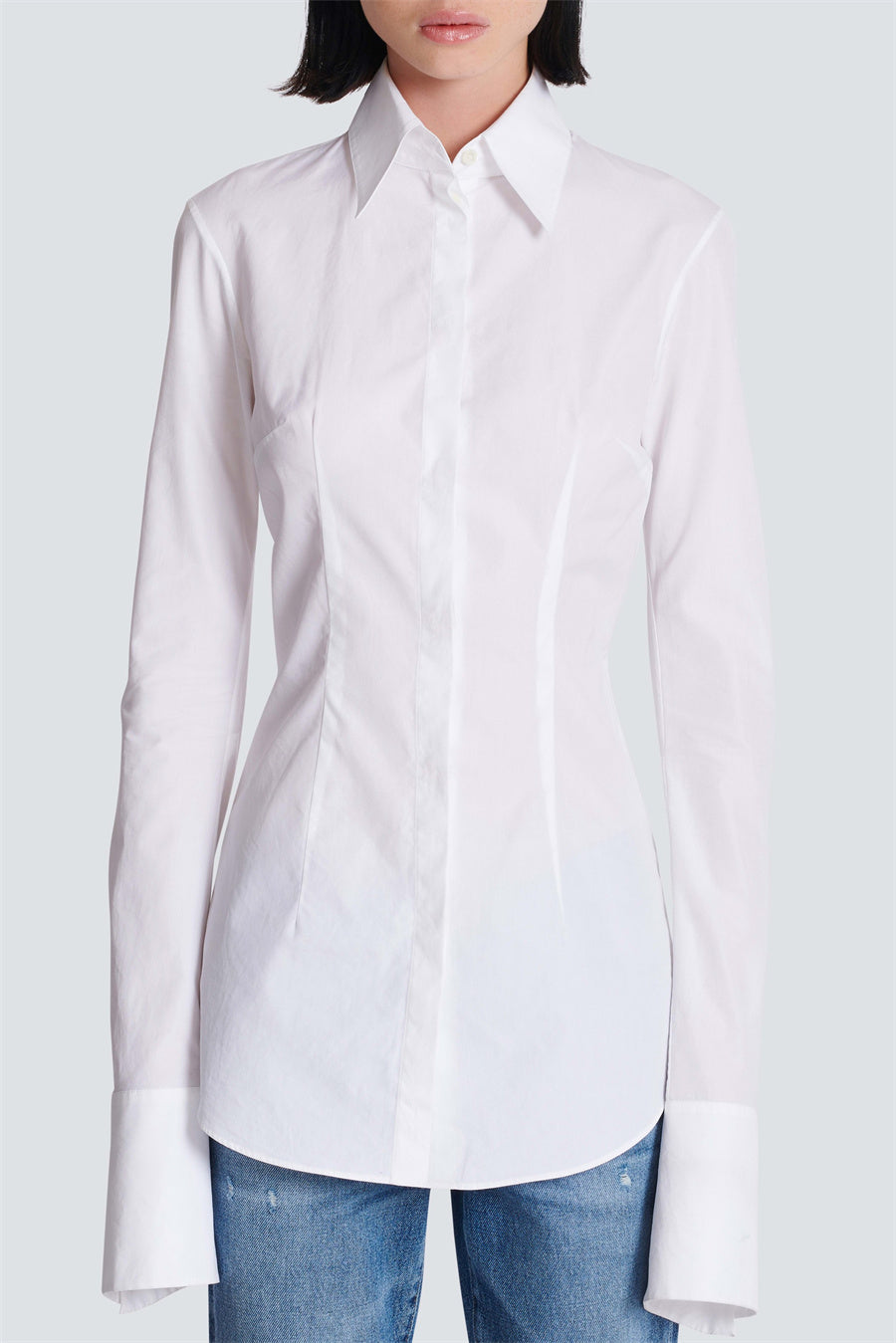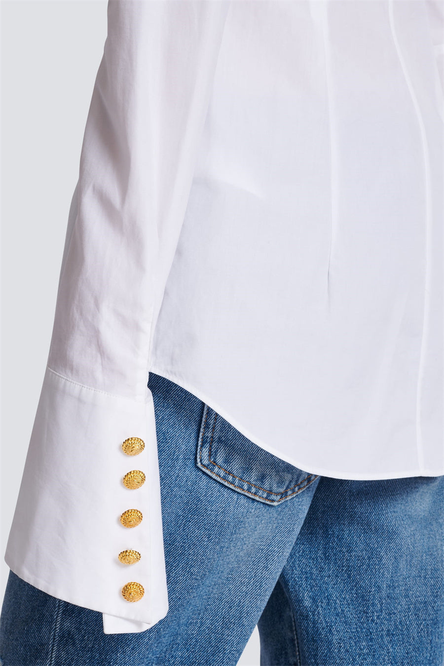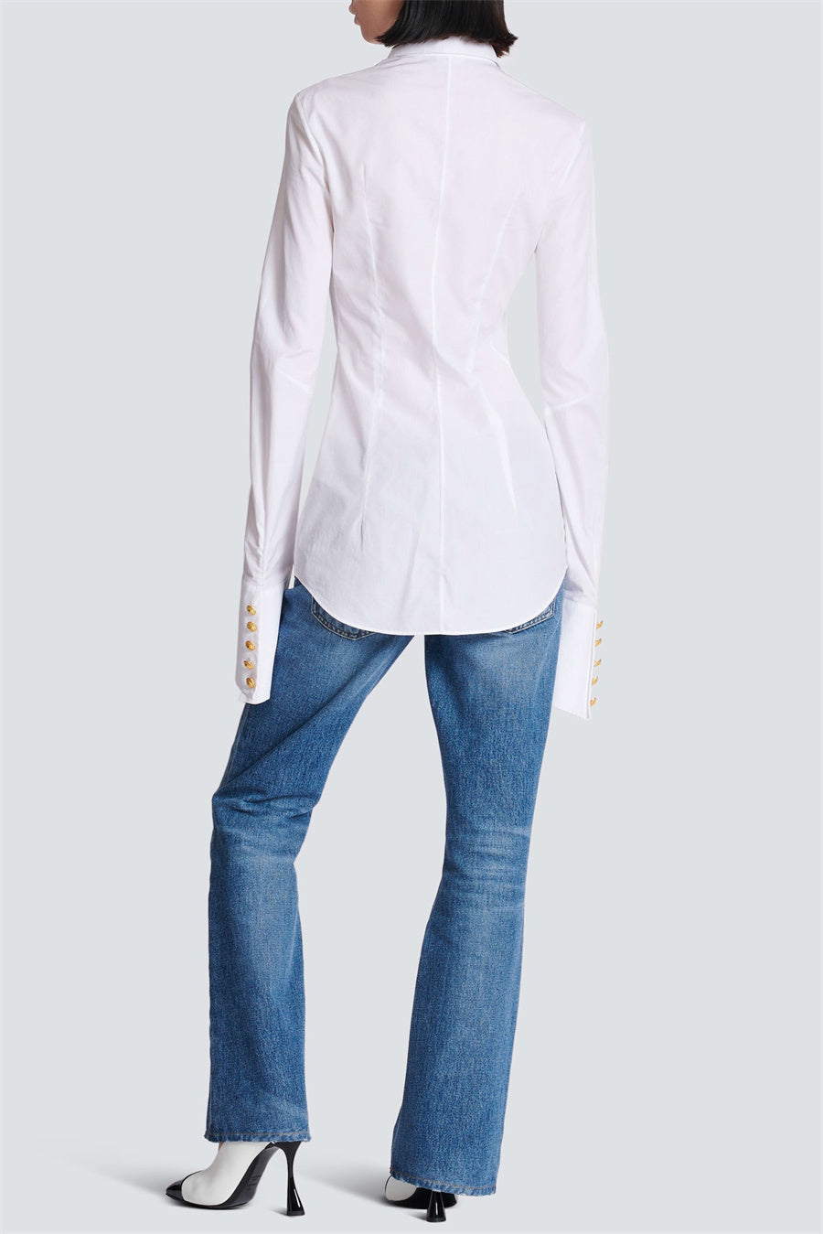 Indulge in luxury with our Zahra Gold Buttons Fitted Shirt. Made with exquisite details like gold buttons sleeves, this shirt will elevate any outfit and make you feel like a sophisticated and exclusive individual. Dress it up or down for a timeless and tasteful look.